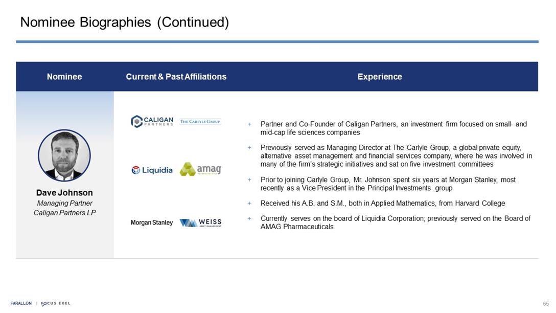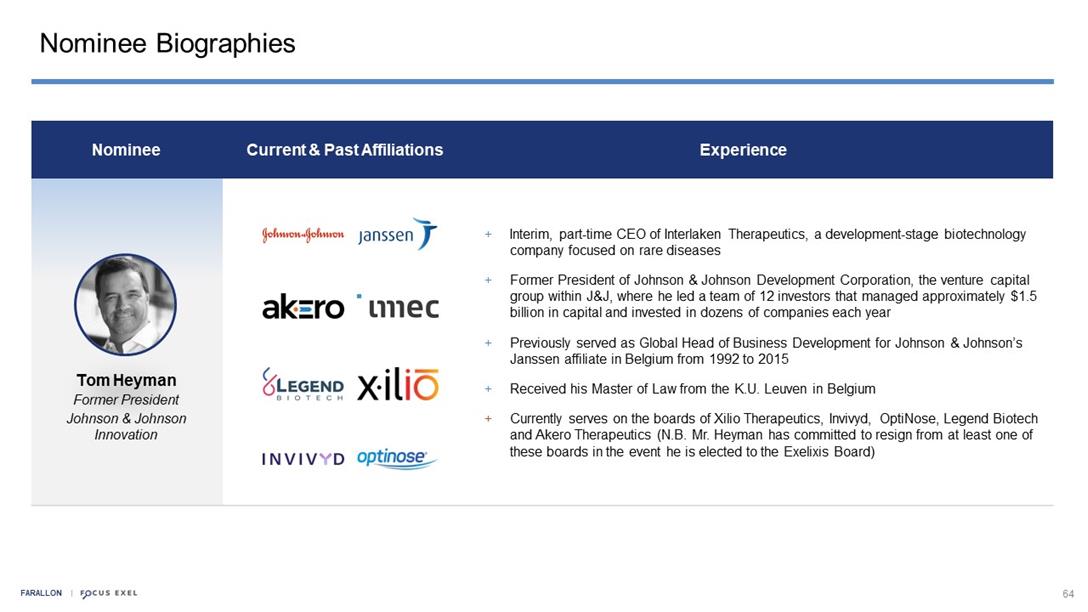 FARALLON | Nominee Biographies 64 Nominee Current & Past Affiliations Experience Tom Heyman Former President Johnson & Johnson Innovation + Interim, part - time CEO of Interlaken Therapeutics, a development - stage biotechnology company focused on rare diseases + Former President of Johnson & Johnson Development Corporation, the venture capital group within J&J, where he led a team of 12 investors that managed approximately $1.5 billion in capital and invested in dozens of companies each year + Previously served as Global Head of Business Development for Johnson & Johnson’s Janssen affiliate in Belgium from 1992 to 2015 + Received his Master of Law from the K.U. Leuven in Belgium + Currently serves on the boards of Xilio Therapeutics, Invivyd , OptiNose , Legend Biotech and Akero Therapeutics (N.B. Mr. Heyman has committed to resign from at least one of these boards in the event he is elected to the Exelixis Board)