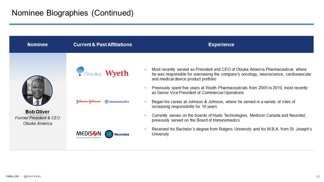 FARALLON | Nominee Biographies (Continued) 65 Nominee Current & Past Affiliations Experience Dave Johnson Managing Partner Caligan Partners LP + Partner and Co - Founder of Caligan Partners, an investment firm focused on small - and mid - cap life sciences companies + Previously served as Managing Director at The Carlyle Group, a global private equity, alternative asset management and financial services company, where he was involved in many of the firm’s strategic initiatives and sat on five investment committees + Prior to joining Carlyle Group, Mr. Johnson spent six years at Morgan Stanley, most recently as a Vice President in the Principal Investments group + Received his A.B. and S.M., both in Applied Mathematics, from Harvard College + Currently serves on the board of Liquidia Corporation; previously served on the Board of AMAG Pharmaceuticals