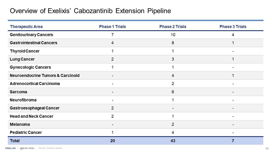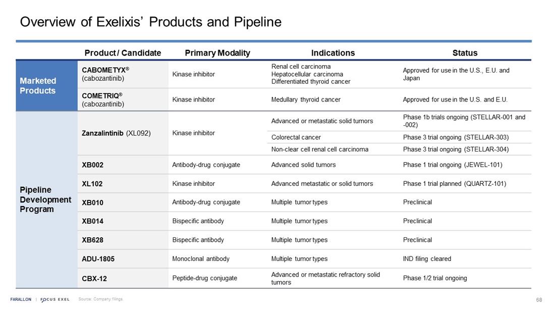 FARALLON | Overview of Exelixis ’ Products and Pipeline 68 Source: Company filings. Product / Candidate Primary Modality Indications Status Marketed Products CABOMETYX ® ( cabozantinib ) Kinase inhibitor Renal cell carcinoma Hepatocellular carcinoma Differentiated thyroid cancer Approved for use in the U.S., E.U. and Japan COMETRIQ ® ( cabozantinib ) Kinase inhibitor Medullary thyroid cancer Approved for use in the U.S. and E.U. Pipeline Development Program Zanzalintinib (XL092) Kinase inhibitor Advanced or metastatic solid tumors Phase 1b trials ongoing (STELLAR - 001 and - 002) Colorectal cancer Phase 3 trial ongoing (STELLAR - 303) Non - clear cell renal cell carcinoma Phase 3 trial ongoing (STELLAR - 304) XB002 Antibody - drug conjugate Advanced solid tumors Phase 1 trial ongoing (JEWEL - 101) XL102 Kinase inhibitor Advanced metastatic or solid tumors Phase 1 trial planned (QUARTZ - 101) XB010 Antibody - drug conjugate Multiple tumor types Preclinical XB014 Bispecific antibody Multiple tumor types Preclinical XB628 Bispecific antibody Multiple tumor types Preclinical ADU - 1805 Monoclonal antibody Multiple tumor types IND filing cleared CBX - 12 Peptide - drug conjugate Advanced or metastatic refractory solid tumors Phase 1/2 trial ongoing