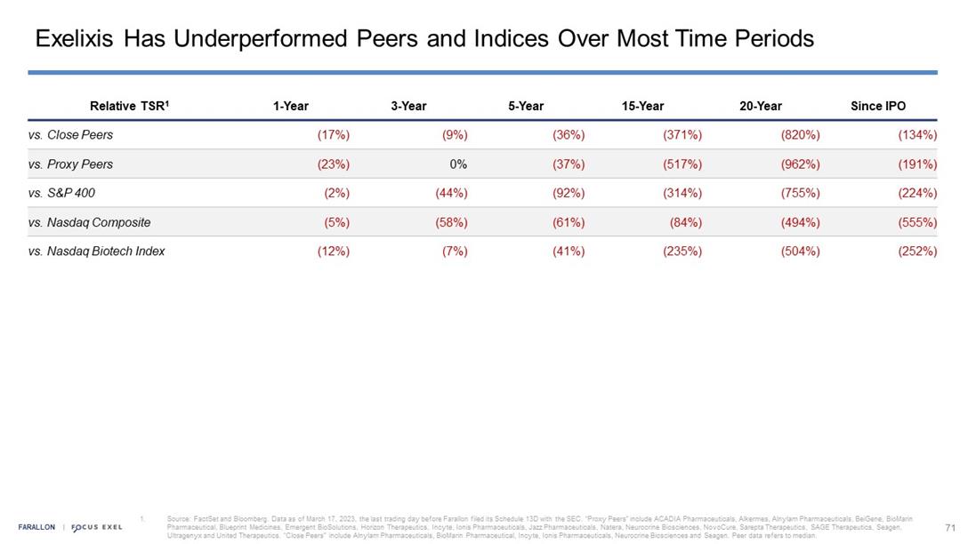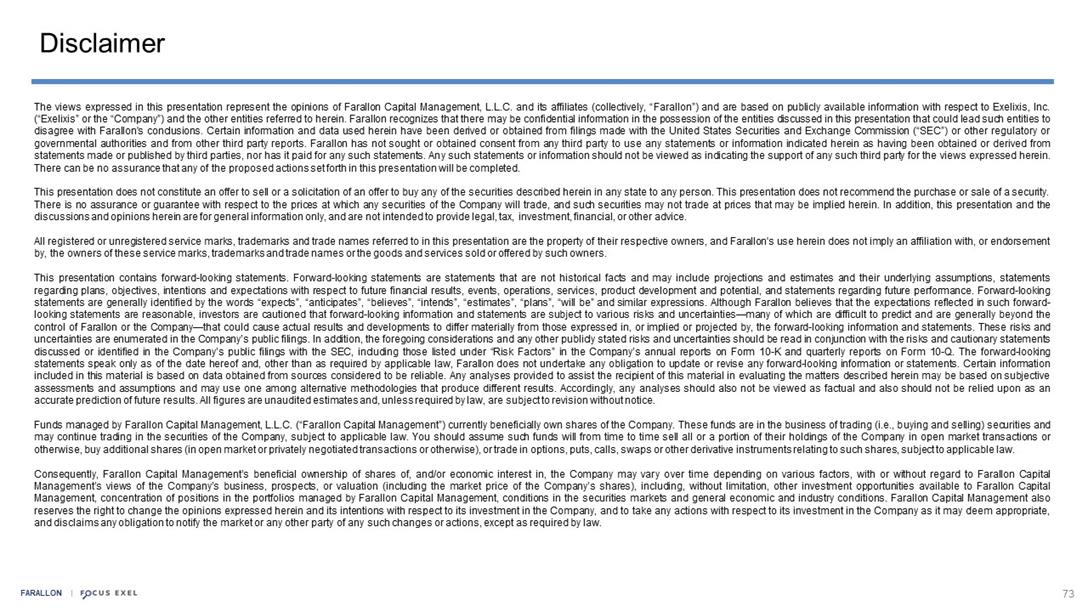 FARALLON | Disclaimer 73 The views expressed in this presentation represent the opinions of Farallon Capital Management, L . L . C . and its affiliates (collectively, “Farallon”) and are based on publicly available information with respect to Exelixis , Inc . (“ Exelixis ” or the “Company”) and the other entities referred to herein . Farallon recognizes that there may be confidential information in the possession of the entities discussed in this presentation that could lead such entities to disagree with Farallon's conclusions . Certain information and data used herein have been derived or obtained from filings made with the United States Securities and Exchange Commission (“SEC”) or other regulatory or governmental authorities and from other third party reports . Farallon has not sought or obtained consent from any third party to use any statements or information indicated herein as having been obtained or derived from statements made or published by third parties, nor has it paid for any such statements . Any such statements or information should not be viewed as indicating the support of any such third party for the views expressed herein . There can be no assurance that any of the proposed actions set forth in this presentation will be completed . This presentation does not constitute an offer to sell or a solicitation of an offer to buy any of the securities described herein in any state to any person . This presentation does not recommend the purchase or sale of a security . There is no assurance or guarantee with respect to the prices at which any securities of the Company will trade, and such securities may not trade at prices that may be implied herein . In addition, this presentation and the discussions and opinions herein are for general information only, and are not intended to provide legal, tax, investment, financial, or other advice . All registered or unregistered service marks, trademarks and trade names referred to in this presentation are the property of their respective owners, and Farallon's use herein does not imply an affiliation with, or endorsement by, the owners of these service marks, trademarks and trade names or the goods and services sold or offered by such owners . This presentation contains forward - looking statements . Forward - looking statements are statements that are not historical facts and may include projections and estimates and their underlying assumptions, statements regarding plans, objectives, intentions and expectations with respect to future financial results, events, operations, services, product development and potential, and statements regarding future performance . Forward - looking statements are generally identified by the words “expects”, “anticipates”, “believes”, “intends”, “estimates”, “plans”, “will be” and similar expressions . Although Farallon believes that the expectations reflected in such forward - looking statements are reasonable, investors are cautioned that forward - looking information and statements are subject to various risks and uncertainties — many of which are difficult to predict and are generally beyond the control of Farallon or the Company — that could cause actual results and developments to differ materially from those expressed in, or implied or projected by, the forward - looking information and statements . These risks and uncertainties are enumerated in the Company’s public filings . In addition, the foregoing considerations and any other publicly stated risks and uncertainties should be read in conjunction with the risks and cautionary statements discussed or identified in the Company’s public filings with the SEC, including those listed under “Risk Factors” in the Company’s annual reports on Form 10 - K and quarterly reports on Form 10 - Q . The forward - looking statements speak only as of the date hereof and, other than as required by applicable law, Farallon does not undertake any obligation to update or revise any forward - looking information or statements . Certain information included in this material is based on data obtained from sources considered to be reliable . Any analyses provided to assist the recipient of this material in evaluating the matters described herein may be based on subjective assessments and assumptions and may use one among alternative methodologies that produce different results . Accordingly, any analyses should also not be viewed as factual and also should not be relied upon as an accurate prediction of future results . All figures are unaudited estimates and, unless required by law, are subject to revision without notice . Funds managed by Farallon Capital Management, L . L . C . (“Farallon Capital Management”) currently beneficially own shares of the Company . These funds are in the business of trading (i . e . , buying and selling) securities and may continue trading in the securities of the Company, subject to applicable law . You should assume such funds will from time to time sell all or a portion of their holdings of the Company in open market transactions or otherwise, buy additional shares (in open market or privately negotiated transactions or otherwise), or trade in options, puts, calls, swaps or other derivative instruments relating to such shares, subject to applicable law . Consequently, Farallon Capital Management’s beneficial ownership of shares of, and/or economic interest in, the Company may vary over time depending on various factors, with or without regard to Farallon Capital Management’s views of the Company’s business, prospects, or valuation (including the market price of the Company’s shares), including, without limitation, other investment opportunities available to Farallon Capital Management, concentration of positions in the portfolios managed by Farallon Capital Management, conditions in the securities markets and general economic and industry conditions . Farallon Capit