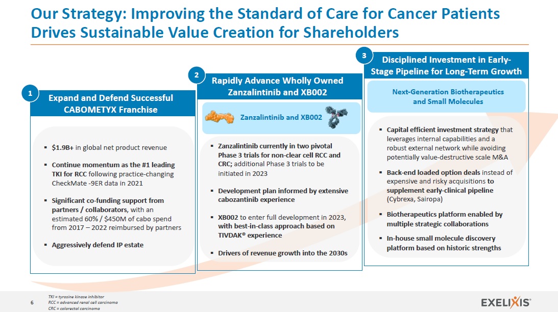 This presentation, including any oral presentation accompanying it, contains forward-looking statements, including, without limitation, statements related to: Exelixis’ commitment to creating long-term, sustainable value for shareholders with a disciplined R&D and capital allocation strategy and leveraging the company’s strengths in drug discovery, clinical development and commercialization to advance medicines designed to improve the standard of care for cancer patients and help them to recover stronger and live longer; Exelixis’ strategy to expand and defend its successful CABOMETYX franchise, including continued momentum and growth for CABOMETYX in light of data from CheckMate -9ER and aggressive defense of the cabozantinib IP estate, as well as completing enrollment and reporting pivotal top-line data from CONTACT-02 in the second half of 2023 and reporting the next OS analysis from COSMIC-313 by YE 2023; the therapeutic and clinical potential of zanzalintinib, including an optimized PK profile and differentiated adverse event profile, as well as Exelixis’ clinical development plans for zanzalintinib, which will be based on Exelixis’ experience with cabozantinib and will include the initiation of additional phase 3 studies in 2023; the therapeutic and clinical potential of XB002, including differentiation across all aspects of ADC technology, potential activity beyond that of TIVDAK, a potentially improved adverse event profile versus TIVDAK and the opportunity for broad development, as well as Exelixis’ clinical development plans for XB002, including entering XB002 into full development in 2023; Exelixis’ belief that zanzalintinib will have worldwide rights with IP protection into the 2040s, and that both zanzalintinib and XB002 will be drivers of revenue growth into the 2030s; Exelixis’ strategy for capital- and time-efficient investments in its early-stage pipeline by leveraging its internal capabilities and external network, as well as continuing to supplement the pipeline with early-stage clinical assets through back-end loaded option deals that “pay for success” rather than acquisitions; the therapeutic and clinical potential for ADU-1805 to be a best-in-class mAb targeting SIRPa, including the opportunity for broad development with activity against all human alleles of SIRPa, unlike other SIRPa therapies; Exelixis’ belief that execution on its diverse pipeline will lead to the company’s next wave of wholly owned cancer drugs and generate long-term growth, with anticipation of multiple pipeline programs progressing to INDs across both biotherapeutics and small molecules; Exelixis’ list of anticipated milestones for 2023 and summary of key 2023 corporate objectives; Exelixis’ 2023 product revenue guidance for the cabozantinib franchise and 2023 R&D spend guidance for its clinical-stage and drug discovery programs; Exelixis’ Board refreshment plans in 2024 and 2025; and other statements that are not historical facts. Any statements that refer to expectations, projections or other characterizations of future events or circumstances are forward-looking statements and are based upon Exelixis’ current plans, assumptions, beliefs, expectations, estimates and projections. Forward-looking statements involve risks and uncertainties. Actual results and the timing of events could differ materially from those anticipated in the forward-looking statements as a result of these risks and uncertainties, which include, without limitation: the degree of market acceptance of CABOMETYX and other Exelixis products in the indications for which they are approved and in the territories where they are approved, and Exelixis’ and its partners’ ability to obtain or maintain coverage and reimbursement for these products; the effectiveness of CABOMETYX and other Exelixis products in comparison to competing products; the level of costs associated with Exelixis’ commercialization, research and development, in-licensing or acquisition of product candidates, and other activities; Exelixis’ ability to maintain and scale adequate sales, marketing, market access and product distribution capabilities for its products or to enter into and maintain agreements with third parties to do so; the availability of data at the referenced times; the potential failure of cabozantinib, zanzalintinib and other Exelixis product candidates, both alone and in combination with other therapies, to demonstrate safety and/or efficacy in clinical testing; uncertainties inherent in the drug discovery and product development process; Exelixis’ dependence on its relationships with its collaboration partners, including their pursuit of regulatory approvals for partnered compounds in new indications, their adherence to their obligations under relevant collaboration agreements and the level of their investment in the resources necessary to complete clinical trials or successfully commercialize partnered compounds in the territories where they are approved; complexities and the unpredictability of the regulatory review and approval processes in the U.S. and elsewhere; Exelixis’ continuing compliance with applicable legal and regulatory requirements; unexpected concerns that may arise as a result of the occurrence of adverse safety events or additional data analyses of clinical trials evaluating cabozantinib and other Exelixis product candidates; Exelixis’ dependence on third-party vendors for the development, manufacture and supply of its products and product candidates; Exelixis’ ability to protect its intellectual property rights; market competition, including the potential for competitors to obtain approval for generic versions of Exelixis’ marketed products; changes in economic and business conditions, including as a result of the COVID-19 pandemic and other global events; and other factors discussed under the caption “Risk Factors” in Exelixis’ Quarterly Report on Form 10-Q filed wit