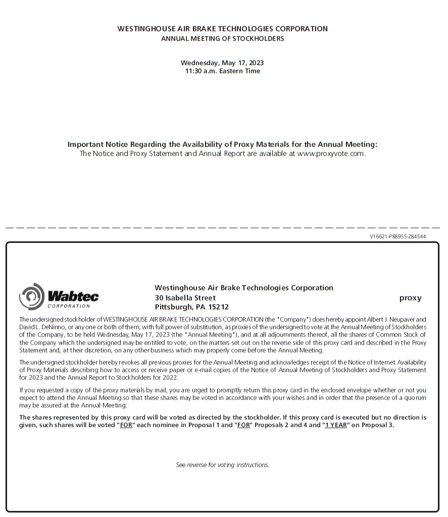 available at www.proxyvote.com. WESTINGHOUSE AIR BRAKE TECHNOLOGIES CORPORATION ANNUAL MEETING OF STOCKHOLDERS Wednesday, May 17, 2023 11:30 a.m. Eastern Time Westinghouse Air Brake Technologies Corporation 30 Isabella Street proxy Pittsburgh, PA