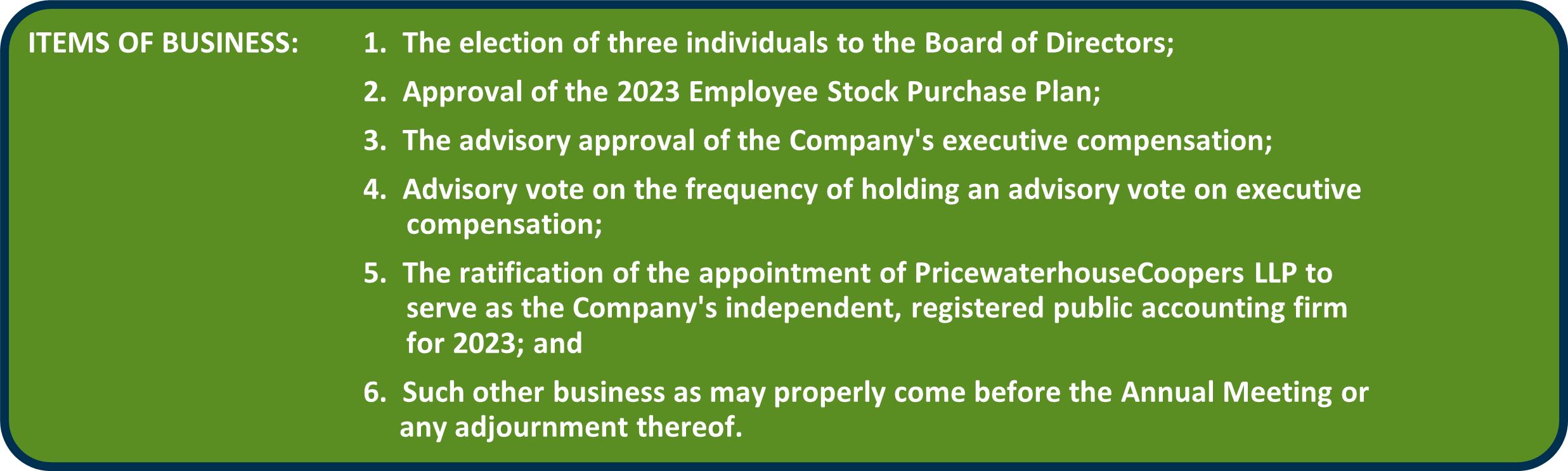 ITEMS OF BUSINESS: 1. The election of three individuals to the Board of Directors; 2. Approval of the 2023 Employee Stock Purchase Plan; 3. The advisory approval of the Company's executive compensation; 4. Advisory vote on the frequency of holding an advisory vote on executive compensation; 5. The ratification of the appointment of PricewaterhouseCoopers LLP to serve as the Company's independent, registered public accounting firm for 2023; and 6. Such other business as may properly come before the Annual Meeting or any adjournment thereof.