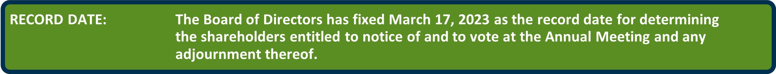 RECORD DATE: The Board of Directors has fixed March 17, 2023 as the record date for determining the shareholders entitled to notice of and to vote at the Annual Meeting and any adjournment thereof.