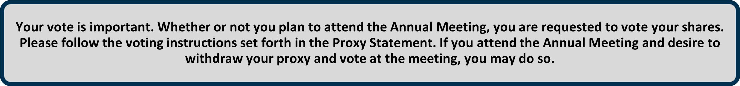 Your vote is important. Whether or not you plan to participate in the Annual Meeting, you are requested to vote your shares. Please follow the voting instructions set forth in the Proxy Statement. If you attend the Annual Meeting and desire to withdraw your proxy and vote at the meeting, you may do so.