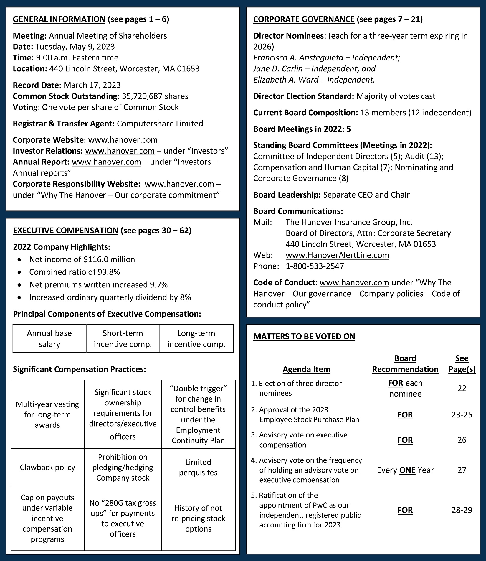 GENERAL INFORMATION (see pages 1 – 6) Meeting: Annual Meeting of Shareholders Date: Tuesday, May 9, 2023 Time: 9:00 a.m. Eastern time Location: 440 Lincoln Street, Worcester, MA 01653 Record Date: March 17, 2023 Common Stock Outstanding: 35,720,687 shares Voting: One vote per share of Common Stock Registrar & Transfer Agent: Computershare Limited Corporate Website: www.hanover.com Investor Relations: www.hanover.com – under “Investors” Annual Report: www.hanover.com – under “Investors – Annual reports” Corporate Responsibility Website: www.hanover.com – under “Why The Hanover – Our corporate commitment” EXECUTIVE COMPENSATION (see pages 30 – 62) 2022 Company Highlights: Net income of $116.0 million Combined ratio of 99.8% Net premiums written increased 9.7% Increased ordinary quarterly dividend by 8% Principal Components of Executive Compensation: Annual base salary Short-term incentive comp. Long-term incentive comp. Significant Compensation Practices: Multi-year vesting for long-term awards Significant stock ownership requirements for directors/executive officers “Double trigger” for change in control benefits under the Employment Continuity Plan Clawback policy Prohibition on pledging/hedging Company stock Limited perquisites Cap on payouts under variable incentive compensation programs No “280G tax gross ups” for payments to executive officers History of not re-pricing stock options CORPORATE GOVERNANCE (see pages 7 – 21) Director Nominees: (each for a three-year term expiring in 2026) Francisco A. Aristeguieta – Independent; Jane D. Carlin – Independent; and Elizabeth A. Ward – Independent. Director Election Standard: Majority of votes cast Current Board Composition: 13 members (12 independent) Board Meetings in 2022: 5 Standing Board Committees (Meetings in 2022): Committee of Independent Directors (5); Audit (13); Compensation and Human Capital (7); Nominating and Corporate Governance (8) Board Leadership: Separate CEO and Chair Board Communications: Mail: The Hanover Insurance Group, Inc. Board of Directors, Attn: Corporate Secretary 440 Lincoln Street, Worcester, MA 01653 Web: www.HanoverAlertLine.com Phone: 1-800-533-2547 Code of Conduct: www.hanover.com under “Why The Hanover—Our governance—Company policies—Code of conduct policy” MATTERS TO BE VOTED ON Agenda Item Board Recommendation See Page(s) 1. Election of three director nominees FOR each nominee 22 2. Approval of the 2023 Employee Stock Purchase Plan FOR 23-25 3. Advisory vote on executive compensation FOR 26 4. Advisory vote on the frequency of holding an advisory vote on executive compensation Every ONE Year 27 5. Ratification of the appointment of PwC as our independent, registered public accounting firm for 2023 FOR 28-29