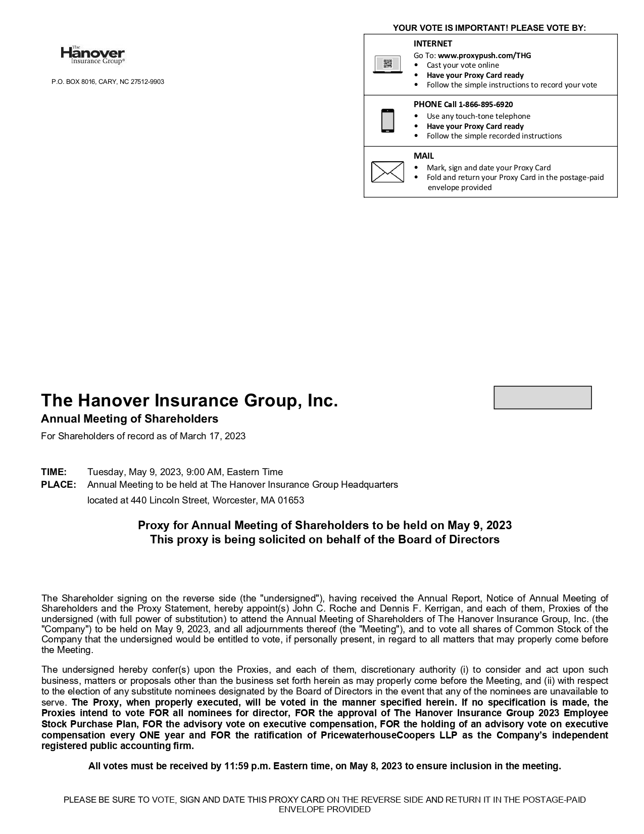 YOUR VOTE IS IMPORTANT! PLEASE VOTE BY: P.O. BOX 8016, CARY, NC 27512-9903 INTERNET Go To: www.proxypush.com/THG • Cast your vote online • Have your Proxy Card ready • Follow the simple instructions to record your vote PHONE Call 1-866-895-6920 • Use any touch-tone telephone • Have your Proxy Card ready • Follow the simple recorded instructions MAIL • Mark, sign and date your Proxy Card • Fold and return your Proxy Card in the postage-paid envelope provided The Hanover Insurance Group, Inc. Annual Meeting of Shareholders For Shareholders of record as of March 17, 2023 TIME: Tuesday, May 9, 2023, 9:00 AM, Eastern Time PLACE: Annual Meeting to be held at The Hanover Insurance Group Headquarters located at 440 Lincoln Street, Worcester, MA 01653 Proxy for Annual Meeting of Shareholders to be held on May 9, 2023 This proxy is being solicited on behalf of the Board of Directors The Shareholder signing on the reverse side (the "undersigned"), having received the Annual Report, Notice of Annual Meeting of Shareholders and the Proxy Statement, hereby appoint(s) John C. Roche and Dennis F. Kerrigan, and each of them, Proxies of the undersigned (with full power of substitution) to attend the Annual Meeting of Shareholders of The Hanover Insurance Group, Inc. (the "Company") to be held on May 9, 2023, and all adjournments thereof (the "Meeting"), and to vote all shares of Common Stock of the Company that the undersigned would be entitled to vote, if personally present, in regard to all matters that may properly come before the Meeting. The undersigned hereby confer(s) upon the Proxies, and each of them, discretionary authority (i) to consider and act upon such business, matters or proposals other than the business set forth herein as may properly come before the Meeting, and (ii) with respect to the election of any substitute nominees designated by the Board of Directors in the event that any of the nominees are unavailable to serve. The Proxy, when properly executed, will be voted in the manner specified herein. If no specification is made, the Proxies intend to vote FOR all nominees for director, FOR the approval of The Hanover Insurance Group 2023 Employee Stock Purchase Plan, FOR the advisory vote on executive compensation, FOR the holding of an advisory vote on executive compensation every ONE year and FOR the ratification of PricewaterhouseCoopers LLP as the Company’s independent registered public accounting firm. All votes must be received by 11:59 p.m. Eastern time, on May 8, 2023 to ensure inclusion in the meeting. PLEASE BE SURE TO VOTE, SIGN AND DATE THIS PROXY CARD ON THE REVERSE SIDE AND RETURN IT IN THE POSTAGE-PAID ENVELOPE PROVIDED