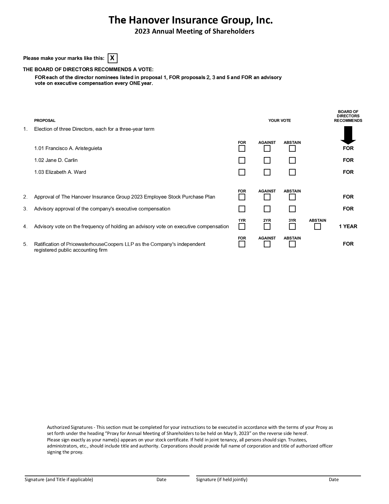 The Hanover Insurance Group, Inc. 2023 Annual Meeting of Shareholders Please make your marks like this: X THE BOARD OF DIRECTORS RECOMMENDS A VOTE: FOR each of the director nominees listed in proposal 1, FOR proposals 2, 3 and 5 and FOR an advisory vote on executive compensation every ONE year. PROPOSAL YOUR VOTE BOARD OF DIRECTORS RECOMMENDS 1. Election of three Directors, each for a three-year term 1.01 Francisco A. Aristeguieta FOR AGAINST ABSTAIN FOR 1.02 Jane D. Carlin FOR 1.03 Elizabeth A. Ward FOR FOR AGAINST ABSTAIN 2. Approval of The Hanover Insurance Group 2023 Employee Stock Purchase Plan FOR 3. Advisory approval of the company's executive compensation FOR 1YR 2YR 3YR ABSTAIN 4. Advisory vote on the frequency of holding an advisory vote on executive compensation 1 YEAR FOR AGAINST ABSTAIN 5. Ratification of PricewaterhouseCoopers LLP as the Company's independent registered public accounting firm FOR Authorized Signatures - This section must be completed for your instructions to be executed in accordance with the terms of your Proxy as set forth under the heading “Proxy for Annual Meeting of Shareholders to be held on May 9, 2023” on the reverse side hereof. Please sign exactly as your name(s) appears on your stock certificate. If held in joint tenancy, all persons should sign. Trustees, administrators, etc., should include title and authority. Corporations should provide full name of corporation and title of authorized officer signing the proxy. Signature (and Title if applicable) Date Signature (if held jointly) Date
