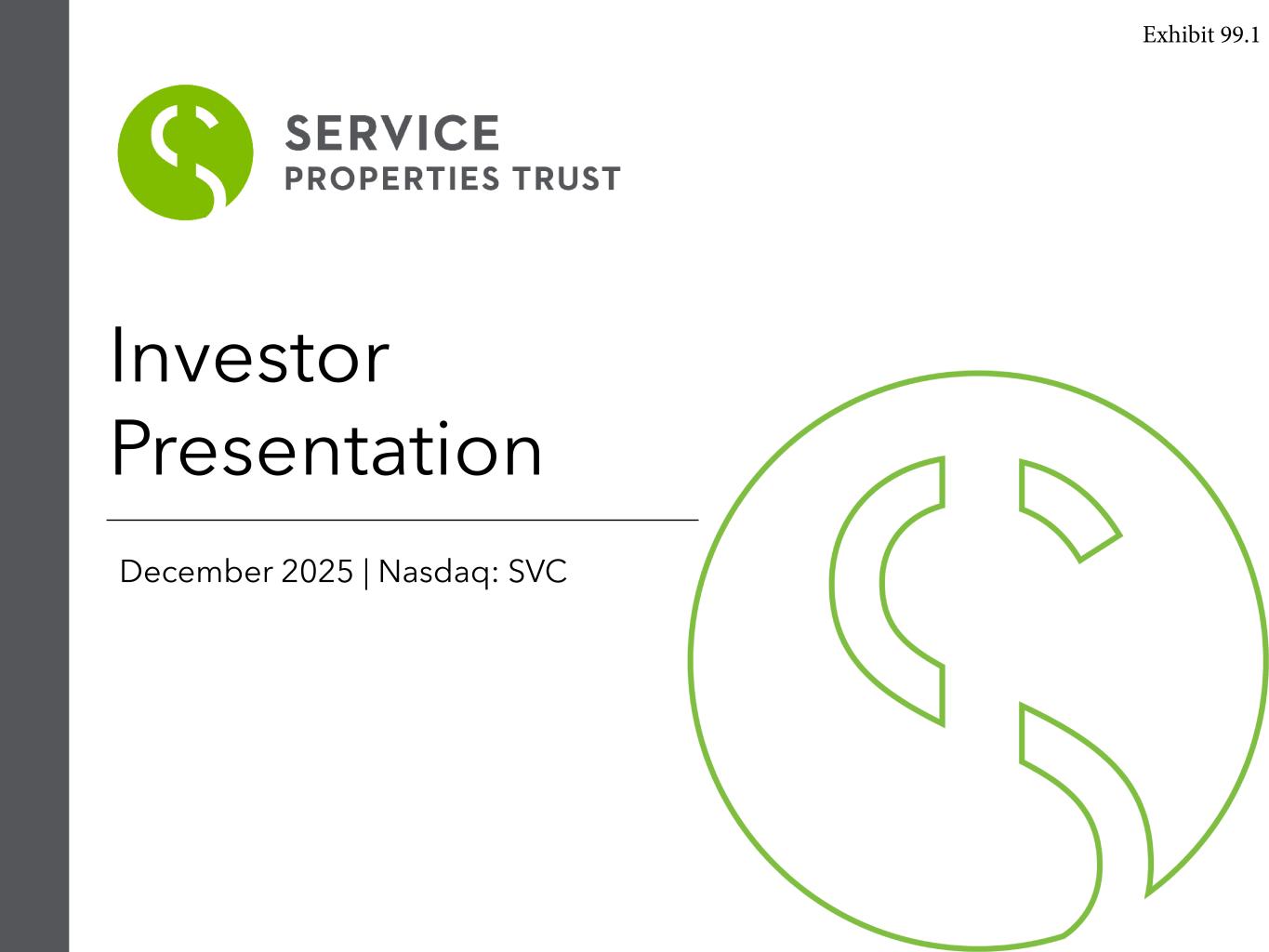 Warning Concerning Forward-Looking Statements, Disclaimers and Non-GAAP Financial Measures This presentation contains forward-looking statements within the meaning of the Private Securities Litigation Reform Act of 1995 and other securities laws that are subject to risks and uncertainties. These statements may include words such as “believe”, “expect”, “anticipate”, “intend”, “plan”, “estimate”, “will”, “may” and negatives or derivatives of these or similar expressions. These forward-looking statements include, among others, statements about: SVC’s ability to generate consistent cash flows and embedded growth, SVC’s contemplated disposition program (and the expected impacts thereof and pro forma information related thereto), SVC’s ability to rebalance its hotel portfolio towards full-service urban and leisure-oriented properties through asset sales and the future composition of its portfolio, SVC’s ability to strengthen its balance sheet and reduce leverage through its planned sales of hotels, SVC’s expectation and ability to reduce capital expenditures and future capital expenditures guidance, SVC’s ability to expand its earnings before interest, taxes, depreciation and amortization, or EBITDA, margin, SVC’s expected use of proceeds from asset sales, SVC’s pending net lease acquisitions, SVC’s ability to redeem its senior unsecured notes and repay its debt financings, and SVC’s renovation and redevelopment initiatives, disciplined acquisition strategy, strategic transformation benefits and key priorities. Forward-looking statements reflect SVC’s current expectations, are based on judgments and assumptions, are inherently uncertain and are subject to risks, uncertainties and other factors, which could cause SVC’s actual results, performance or achievements to differ materially from expected future results, performance or achievements expressed or implied in those forward-looking statements. Some of the risks, uncertainties and other factors that may cause SVC’s actual results, performance or achievements to differ materially from those expressed or implied by forward-looking statements include, but are not limited to, the following: the ability of Sonesta International Hotels Corporation, or collectively with its parent and subsidiaries, Sonesta, to successfully operate the hotels it manages for SVC; SVC’s ability and the ability of SVC’s managers and tenants to operate under unfavorable market and commercial real estate industry conditions due to, among other things, uncertainties surrounding interest rates and inflation, supply chain disruptions, emerging technologies, volatility in the public equity and debt markets, effect of or changes to tariffs or trading policies, pandemics, geopolitical instability and tensions, economic downturns or a possible recession, labor market conditions or changes in real estate utilization; SVC’s ability to sell properties at prices it targets, and the timing of such sales; SVC’s ability to repay or refinance its debts as they mature or otherwise become due; SVC’s ability to maintain sufficient liquidity, including the availability of borrowings under its revolving credit facility and the variable funding note, or VFN; SVC’s ability to pay interest on and principal of its debt; the impact of changes in U.S. and foreign government administrative policies, including the imposition of or increases in tariffs and changes to existing trade agreements, on macroeconomic conditions, supply chains and the cost of products SVC’s operators use, and on the results of operations of SVC’s operators and SVC; whether and the extent to which SVC’s managers and tenants will pay the contractual amounts of returns, rents or other obligations due to SVC; competition within the commercial real estate, hotel, transportation and travel center and other industries in which SVC’s managers and tenants operate, particularly in those markets in which SVC’s properties are located; SVC’s ability to make cost-effective improvements to SVC’s properties that enhance their appeal to hotel guests and net lease tenants; SVC’s ability to pay distributions to its shareholders and to increase or sustain the amount of such distributions; SVC’s ability to acquire properties that realize its targeted returns; SVC’s ability to identify properties that it wants to acquire or to negotiate acceptable purchase prices, acquisition financing terms, management agreements or lease terms for new properties, or ability to complete acquisitions; SVC’s ability to raise or appropriately balance the use of debt or equity capital; potential defaults under SVC’s management agreements and leases by its managers and tenants; SVC’s ability to increase hotel room rates and rents at its net leased properties as SVC’s leases expire in excess of its operating expenses and to grow its business; SVC’s ability to increase and maintain hotel room and net lease property occupancy at its properties; SVC’s ability to engage and retain qualified managers and tenants for its hotels and net lease properties on satisfactory terms; SVC’s ability to diversify its sources of rents and returns that improve the security of its cash flows; SVC’s credit ratings; the ability of SVC’s manager, The RMR Group LLC, or RMR, to successfully manage SVC; actual and potential conflicts of interest with SVC’s related parties, including its Managing Trustees, Sonesta, RMR and others affiliated with them; SVC’s ability to realize benefits from the scale, geographic diversity, strategic locations and variety of service levels of its hotels; limitations imposed by and SVC’s ability to satisfy complex rules to maintain its qualification for taxation as a real estate investment trust, or REIT, for U.S. federal income tax purposes; compliance with, and changes to, federal, state and local laws and regulations, accounting rules, tax laws and 