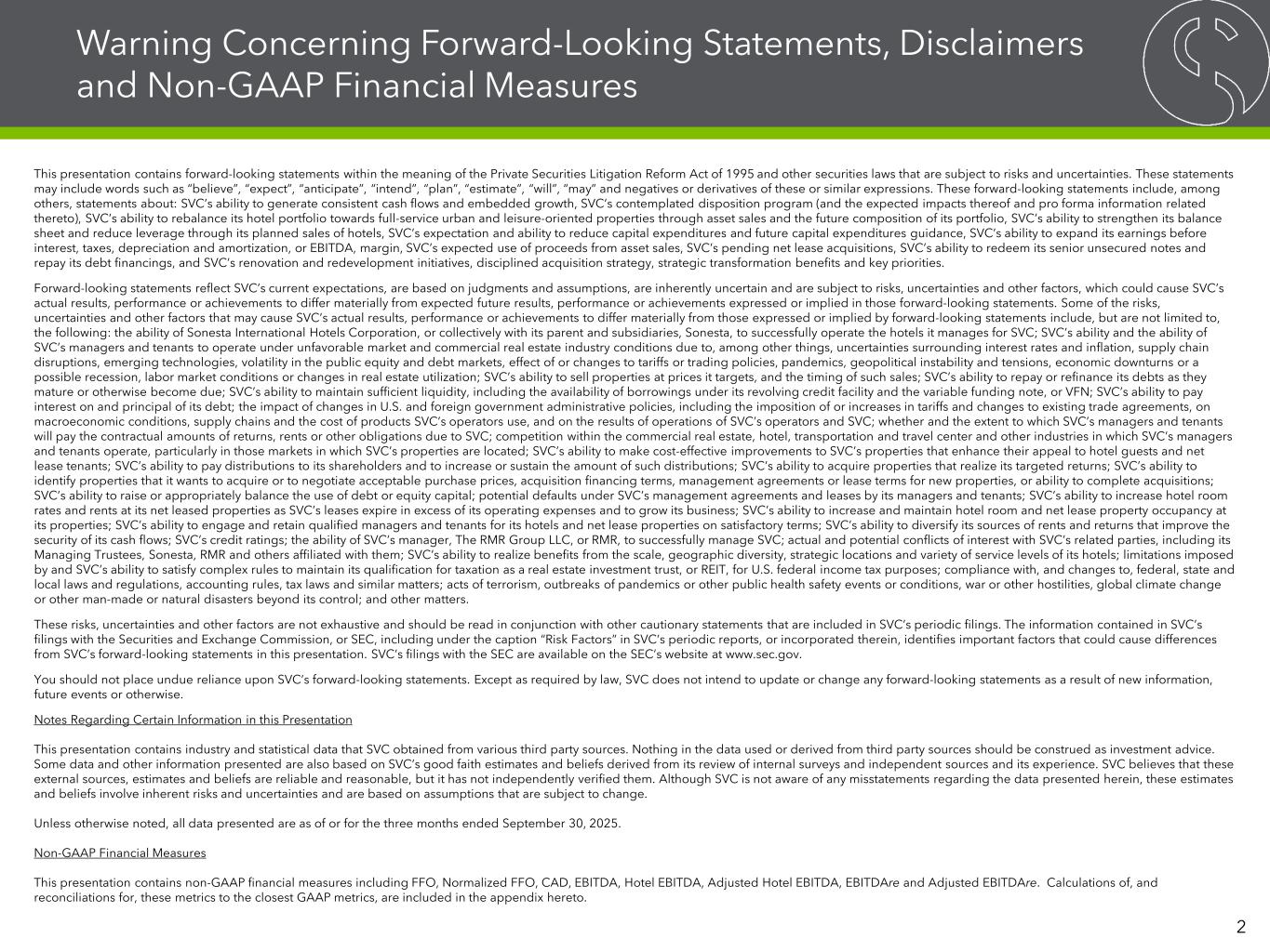 Warning Concerning Forward-Looking Statements, Disclaimers and Non-GAAP Financial Measures This presentation contains forward-looking statements within the meaning of the Private Securities Litigation Reform Act of 1995 and other securities laws that are subject to risks and uncertainties. These statements may include words such as “believe”, “expect”, “anticipate”, “intend”, “plan”, “estimate”, “will”, “may” and negatives or derivatives of these or similar expressions. These forward-looking statements include, among others, statements about: SVC’s ability to generate consistent cash flows and embedded growth, SVC’s contemplated disposition program (and the expected impacts thereof and pro forma information related thereto), SVC’s ability to rebalance its hotel portfolio towards full-service urban and leisure-oriented properties through asset sales and the future composition of its portfolio, SVC’s ability to strengthen its balance sheet and reduce leverage through its planned sales of hotels, SVC’s expectation and ability to reduce capital expenditures and future capital expenditures guidance, SVC’s ability to expand its earnings before interest, taxes, depreciation and amortization, or EBITDA, margin, SVC’s expected use of proceeds from asset sales, SVC’s pending net lease acquisitions, SVC’s ability to redeem its senior unsecured notes and repay its debt financings, and SVC’s renovation and redevelopment initiatives, disciplined acquisition strategy, strategic transformation benefits and key priorities. Forward-looking statements reflect SVC’s current expectations, are based on judgments and assumptions, are inherently uncertain and are subject to risks, uncertainties and other factors, which could cause SVC’s actual results, performance or achievements to differ materially from expected future results, performance or achievements expressed or implied in those forward-looking statements. Some of the risks, uncertainties and other factors that may cause SVC’s actual results, performance or achievements to differ materially from those expressed or implied by forward-looking statements include, but are not limited to, the following: the ability of Sonesta International Hotels Corporation, or collectively with its parent and subsidiaries, Sonesta, to successfully operate the hotels it manages for SVC; SVC’s ability and the ability of SVC’s managers and tenants to operate under unfavorable market and commercial real estate industry conditions due to, among other things, uncertainties surrounding interest rates and inflation, supply chain disruptions, emerging technologies, volatility in the public equity and debt markets, effect of or changes to tariffs or trading policies, pandemics, geopolitical instability and tensions, economic downturns or a possible recession, labor market conditions or changes in real estate utilization; SVC’s ability to sell properties at prices it targets, and the timing of such sales; SVC’s ability to repay or refinance its debts as they mature or otherwise become due; SVC’s ability to maintain sufficient liquidity, including the availability of borrowings under its revolving credit facility and the variable funding note, or VFN; SVC’s ability to pay interest on and principal of its debt; the impact of changes in U.S. and foreign government administrative policies, including the imposition of or increases in tariffs and changes to existing trade agreements, on macroeconomic conditions, supply chains and the cost of products SVC’s operators use, and on the results of operations of SVC’s operators and SVC; whether and the extent to which SVC’s managers and tenants will pay the contractual amounts of returns, rents or other obligations due to SVC; competition within the commercial real estate, hotel, transportation and travel center and other industries in which SVC’s managers and tenants operate, particularly in those markets in which SVC’s properties are located; SVC’s ability to make cost-effective improvements to SVC’s properties that enhance their appeal to hotel guests and net lease tenants; SVC’s ability to pay distributions to its shareholders and to increase or sustain the amount of such distributions; SVC’s ability to acquire properties that realize its targeted returns; SVC’s ability to identify properties that it wants to acquire or to negotiate acceptable purchase prices, acquisition financing terms, management agreements or lease terms for new properties, or ability to complete acquisitions; SVC’s ability to raise or appropriately balance the use of debt or equity capital; potential defaults under SVC’s management agreements and leases by its managers and tenants; SVC’s ability to increase hotel room rates and rents at its net leased properties as SVC’s leases expire in excess of its operating expenses and to grow its business; SVC’s ability to increase and maintain hotel room and net lease property occupancy at its properties; SVC’s ability to engage and retain qualified managers and tenants for its hotels and net lease properties on satisfactory terms; SVC’s ability to diversify its sources of rents and returns that improve the security of its cash flows; SVC’s credit ratings; the ability of SVC’s manager, The RMR Group LLC, or RMR, to successfully manage SVC; actual and potential conflicts of interest with SVC’s related parties, including its Managing Trustees, Sonesta, RMR and others affiliated with them; SVC’s ability to realize benefits from the scale, geographic diversity, strategic locations and variety of service levels of its hotels; limitations imposed by and SVC’s ability to satisfy complex rules to maintain its qualification for taxation as a real estate investment trust, or REIT, for U.S. federal income tax purposes; compliance with, and changes to, federal, state and local laws and regulations, accounting rules, tax laws and 
