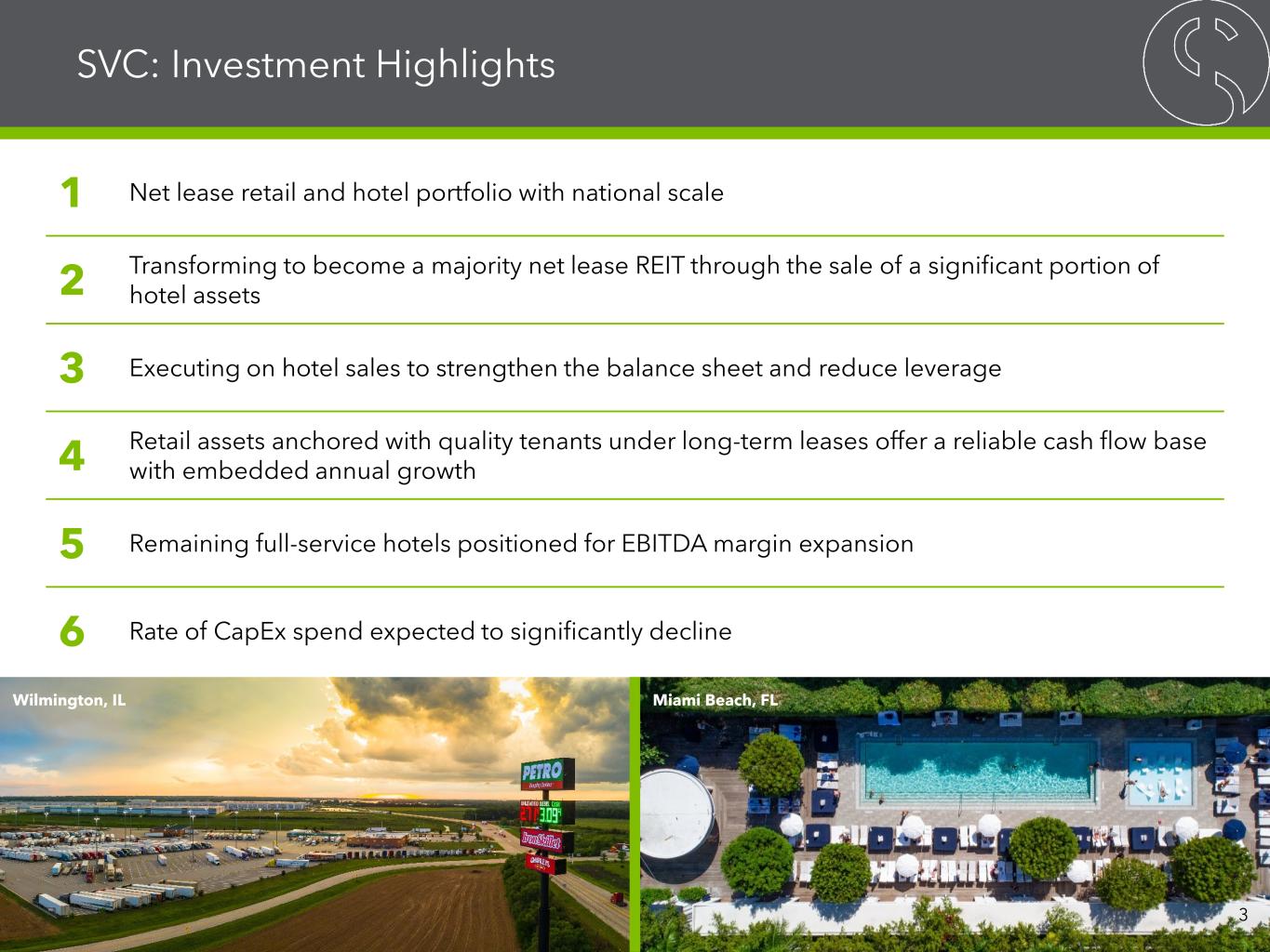 Warning Concerning Forward-Looking Statements, Disclaimers and Non-GAAP Financial Measures This presentation contains forward-looking statements within the meaning of the Private Securities Litigation Reform Act of 1995 and other securities laws that are subject to risks and uncertainties. These statements may include words such as “believe”, “expect”, “anticipate”, “intend”, “plan”, “estimate”, “will”, “may” and negatives or derivatives of these or similar expressions. These forward-looking statements include, among others, statements about: SVC’s ability to generate consistent cash flows and embedded growth, SVC’s contemplated disposition program (and the expected impacts thereof and pro forma information related thereto), SVC’s ability to rebalance its hotel portfolio towards full-service urban and leisure-oriented properties through asset sales and the future composition of its portfolio, SVC’s ability to strengthen its balance sheet and reduce leverage through its planned sales of hotels, SVC’s expectation and ability to reduce capital expenditures and future capital expenditures guidance, SVC’s ability to expand its earnings before interest, taxes, depreciation and amortization, or EBITDA, margin, SVC’s expected use of proceeds from asset sales, SVC’s pending net lease acquisitions, SVC’s ability to redeem its senior unsecured notes and repay its debt financings, and SVC’s renovation and redevelopment initiatives, disciplined acquisition strategy, strategic transformation benefits and key priorities. Forward-looking statements reflect SVC’s current expectations, are based on judgments and assumptions, are inherently uncertain and are subject to risks, uncertainties and other factors, which could cause SVC’s actual results, performance or achievements to differ materially from expected future results, performance or achievements expressed or implied in those forward-looking statements. Some of the risks, uncertainties and other factors that may cause SVC’s actual results, performance or achievements to differ materially from those expressed or implied by forward-looking statements include, but are not limited to, the following: the ability of Sonesta International Hotels Corporation, or collectively with its parent and subsidiaries, Sonesta, to successfully operate the hotels it manages for SVC; SVC’s ability and the ability of SVC’s managers and tenants to operate under unfavorable market and commercial real estate industry conditions due to, among other things, uncertainties surrounding interest rates and inflation, supply chain disruptions, emerging technologies, volatility in the public equity and debt markets, effect of or changes to tariffs or trading policies, pandemics, geopolitical instability and tensions, economic downturns or a possible recession, labor market conditions or changes in real estate utilization; SVC’s ability to sell properties at prices it targets, and the timing of such sales; SVC’s ability to repay or refinance its debts as they mature or otherwise become due; SVC’s ability to maintain sufficient liquidity, including the availability of borrowings under its revolving credit facility and the variable funding note, or VFN; SVC’s ability to pay interest on and principal of its debt; the impact of changes in U.S. and foreign government administrative policies, including the imposition of or increases in tariffs and changes to existing trade agreements, on macroeconomic conditions, supply chains and the cost of products SVC’s operators use, and on the results of operations of SVC’s operators and SVC; whether and the extent to which SVC’s managers and tenants will pay the contractual amounts of returns, rents or other obligations due to SVC; competition within the commercial real estate, hotel, transportation and travel center and other industries in which SVC’s managers and tenants operate, particularly in those markets in which SVC’s properties are located; SVC’s ability to make cost-effective improvements to SVC’s properties that enhance their appeal to hotel guests and net lease tenants; SVC’s ability to pay distributions to its shareholders and to increase or sustain the amount of such distributions; SVC’s ability to acquire properties that realize its targeted returns; SVC’s ability to identify properties that it wants to acquire or to negotiate acceptable purchase prices, acquisition financing terms, management agreements or lease terms for new properties, or ability to complete acquisitions; SVC’s ability to raise or appropriately balance the use of debt or equity capital; potential defaults under SVC’s management agreements and leases by its managers and tenants; SVC’s ability to increase hotel room rates and rents at its net leased properties as SVC’s leases expire in excess of its operating expenses and to grow its business; SVC’s ability to increase and maintain hotel room and net lease property occupancy at its properties; SVC’s ability to engage and retain qualified managers and tenants for its hotels and net lease properties on satisfactory terms; SVC’s ability to diversify its sources of rents and returns that improve the security of its cash flows; SVC’s credit ratings; the ability of SVC’s manager, The RMR Group LLC, or RMR, to successfully manage SVC; actual and potential conflicts of interest with SVC’s related parties, including its Managing Trustees, Sonesta, RMR and others affiliated with them; SVC’s ability to realize benefits from the scale, geographic diversity, strategic locations and variety of service levels of its hotels; limitations imposed by and SVC’s ability to satisfy complex rules to maintain its qualification for taxation as a real estate investment trust, or REIT, for U.S. federal income tax purposes; compliance with, and changes to, federal, state and local laws and regulations, accounting rules, tax laws and 