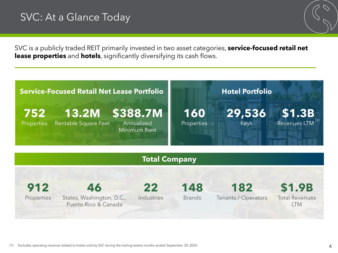 Warning Concerning Forward-Looking Statements, Disclaimers and Non-GAAP Financial Measures This presentation contains forward-looking statements within the meaning of the Private Securities Litigation Reform Act of 1995 and other securities laws that are subject to risks and uncertainties. These statements may include words such as “believe”, “expect”, “anticipate”, “intend”, “plan”, “estimate”, “will”, “may” and negatives or derivatives of these or similar expressions. These forward-looking statements include, among others, statements about: SVC’s ability to generate consistent cash flows and embedded growth, SVC’s contemplated disposition program (and the expected impacts thereof and pro forma information related thereto), SVC’s ability to rebalance its hotel portfolio towards full-service urban and leisure-oriented properties through asset sales and the future composition of its portfolio, SVC’s ability to strengthen its balance sheet and reduce leverage through its planned sales of hotels, SVC’s expectation and ability to reduce capital expenditures and future capital expenditures guidance, SVC’s ability to expand its earnings before interest, taxes, depreciation and amortization, or EBITDA, margin, SVC’s expected use of proceeds from asset sales, SVC’s pending net lease acquisitions, SVC’s ability to redeem its senior unsecured notes and repay its debt financings, and SVC’s renovation and redevelopment initiatives, disciplined acquisition strategy, strategic transformation benefits and key priorities. Forward-looking statements reflect SVC’s current expectations, are based on judgments and assumptions, are inherently uncertain and are subject to risks, uncertainties and other factors, which could cause SVC’s actual results, performance or achievements to differ materially from expected future results, performance or achievements expressed or implied in those forward-looking statements. Some of the risks, uncertainties and other factors that may cause SVC’s actual results, performance or achievements to differ materially from those expressed or implied by forward-looking statements include, but are not limited to, the following: the ability of Sonesta International Hotels Corporation, or collectively with its parent and subsidiaries, Sonesta, to successfully operate the hotels it manages for SVC; SVC’s ability and the ability of SVC’s managers and tenants to operate under unfavorable market and commercial real estate industry conditions due to, among other things, uncertainties surrounding interest rates and inflation, supply chain disruptions, emerging technologies, volatility in the public equity and debt markets, effect of or changes to tariffs or trading policies, pandemics, geopolitical instability and tensions, economic downturns or a possible recession, labor market conditions or changes in real estate utilization; SVC’s ability to sell properties at prices it targets, and the timing of such sales; SVC’s ability to repay or refinance its debts as they mature or otherwise become due; SVC’s ability to maintain sufficient liquidity, including the availability of borrowings under its revolving credit facility and the variable funding note, or VFN; SVC’s ability to pay interest on and principal of its debt; the impact of changes in U.S. and foreign government administrative policies, including the imposition of or increases in tariffs and changes to existing trade agreements, on macroeconomic conditions, supply chains and the cost of products SVC’s operators use, and on the results of operations of SVC’s operators and SVC; whether and the extent to which SVC’s managers and tenants will pay the contractual amounts of returns, rents or other obligations due to SVC; competition within the commercial real estate, hotel, transportation and travel center and other industries in which SVC’s managers and tenants operate, particularly in those markets in which SVC’s properties are located; SVC’s ability to make cost-effective improvements to SVC’s properties that enhance their appeal to hotel guests and net lease tenants; SVC’s ability to pay distributions to its shareholders and to increase or sustain the amount of such distributions; SVC’s ability to acquire properties that realize its targeted returns; SVC’s ability to identify properties that it wants to acquire or to negotiate acceptable purchase prices, acquisition financing terms, management agreements or lease terms for new properties, or ability to complete acquisitions; SVC’s ability to raise or appropriately balance the use of debt or equity capital; potential defaults under SVC’s management agreements and leases by its managers and tenants; SVC’s ability to increase hotel room rates and rents at its net leased properties as SVC’s leases expire in excess of its operating expenses and to grow its business; SVC’s ability to increase and maintain hotel room and net lease property occupancy at its properties; SVC’s ability to engage and retain qualified managers and tenants for its hotels and net lease properties on satisfactory terms; SVC’s ability to diversify its sources of rents and returns that improve the security of its cash flows; SVC’s credit ratings; the ability of SVC’s manager, The RMR Group LLC, or RMR, to successfully manage SVC; actual and potential conflicts of interest with SVC’s related parties, including its Managing Trustees, Sonesta, RMR and others affiliated with them; SVC’s ability to realize benefits from the scale, geographic diversity, strategic locations and variety of service levels of its hotels; limitations imposed by and SVC’s ability to satisfy complex rules to maintain its qualification for taxation as a real estate investment trust, or REIT, for U.S. federal income tax purposes; compliance with, and changes to, federal, state and local laws and regulations, accounting rules, tax laws and 