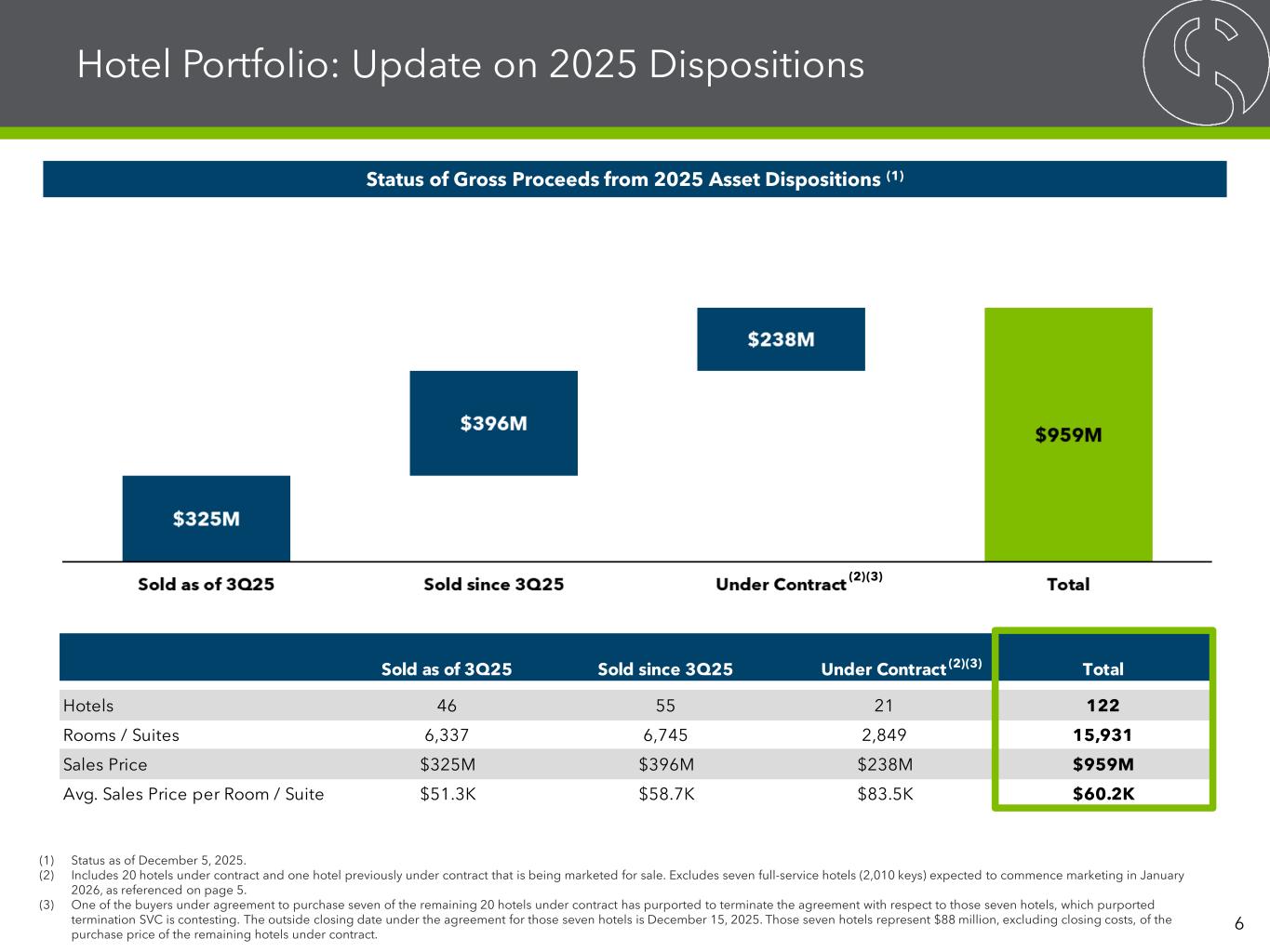 Under Contract (2)(3) 2025 Active Hotel Sales Pro Forma 7 Hotels 160 55 21 84 Keys 29,536 6,745 2,849 19,942 ADR $147.86 $95.26 $120.43 $171.04 Occupancy 64.8% 67.9% 67.0% 63.5% RevPAR $95.85 $64.72 $80.64 $108.56 Operating Revenues $1,324M $166M $87M $1,071M EBITDA $168M $26M $8M $135M EBITDA Margin 12.7% 15.7% 9.0% 12.6% Pro Forma Hotel Portfolio 9/30/25 (1) Hotel Portfolio Sold Since 3Q25 Note: Figures presented are LTM 3Q25. (1) Results of all hotels owned as of September 30, 2025. Excludes $150 million of operating revenue and $4 million of EBITDA related to hotels sold by SVC during the trailing twelve months ended September 30, 2025. (2) Includes 20 hotels under contract and one hotel previously under contract that is being marketed for sale. Excludes seven full-service hotels (2,010 keys) expected to commence marketing in January 2026, as referenced on page 5. (3) One of the buyers under agreement to purchase seven of the remaining 20 hotels under contract has purported to terminate the agreement with respect to those seven hotels, which purported termination SVC is contesting. The outside closing date under the agreement for those seven hotels is December 15, 2025. Those seven hotels represent $88 million, excluding closing costs, of the purchase price of the remaining hotels under contract.