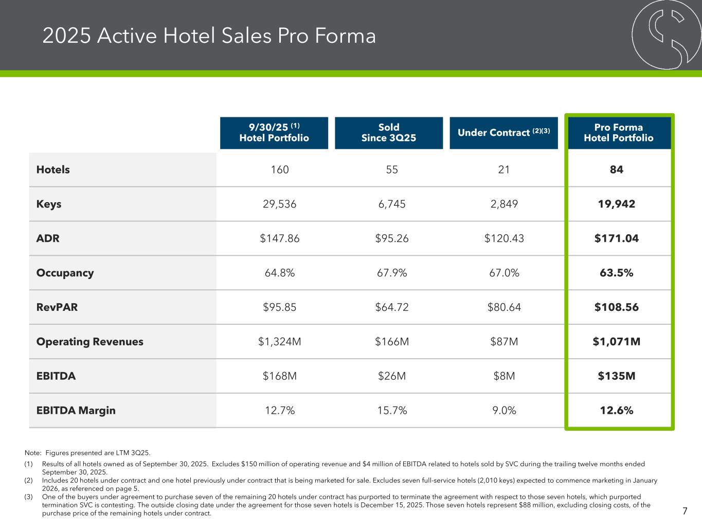 Sold as of 3Q25 Sold since 3Q25 Under Contract Total Hotels 46 55 21 122 Rooms / Suites 6,337 6,745 2,849 15,931 Sales Price $325M $396M $238M $959M Avg. Sales Price per Room / Suite $51.3K $58.7K $83.5K $60.2K Hotel Portfolio: Update on 2025 Dispositions 6 (1) Status as of December 5, 2025. (2) Includes 20 hotels under contract and one hotel previously under contract that is being marketed for sale. Excludes seven full-service hotels (2,010 keys) expected to commence marketing in January 2026, as referenced on page 5. (3) One of the buyers under agreement to purchase seven of the remaining 20 hotels under contract has purported to terminate the agreement with respect to those seven hotels, which purported termination SVC is contesting. The outside closing date under the agreement for those seven hotels is December 15, 2025. Those seven hotels represent $88 million, excluding closing costs, of the purchase price of the remaining hotels under contract. Status of Gross Proceeds from 2025 Asset Dispositions (1) (2) (2)(3) (3)