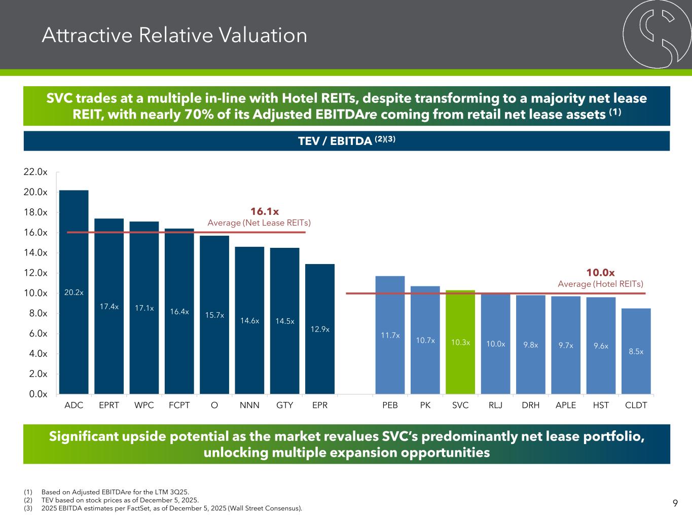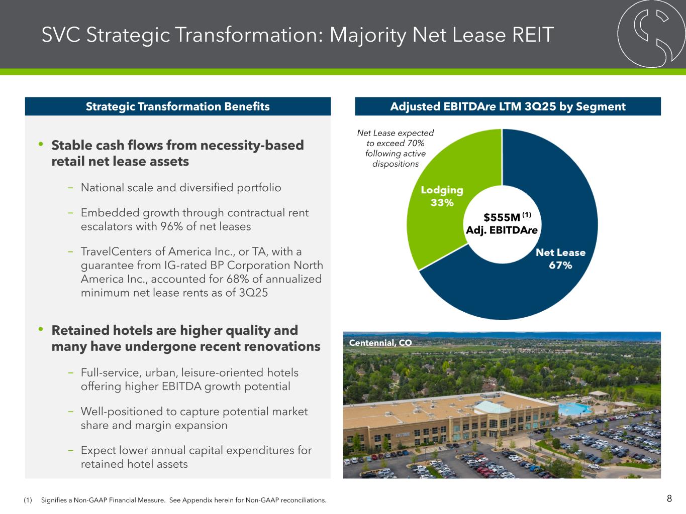 SVC Strategic Transformation: Majority Net Lease REIT 8 Strategic Transformation Benefits • Stable cash flows from necessity-based retail net lease assets – National scale and diversified portfolio – Embedded growth through contractual rent escalators with 96% of net leases – TravelCenters of America Inc., or TA, with a guarantee from IG-rated BP Corporation North America Inc., accounted for 68% of annualized minimum net lease rents as of 3Q25 • Retained hotels are higher quality and many have undergone recent renovations – Full-service, urban, leisure-oriented hotels offering higher EBITDA growth potential – Well-positioned to capture potential market share and margin expansion – Expect lower annual capital expenditures for retained hotel assets Centennial, CO Adjusted EBITDAre LTM 3Q25 by Segment $555M Adj. EBITDAre Net Lease expected to exceed 70% following active dispositions (1) Signifies a Non-GAAP Financial Measure. See Appendix herein for Non-GAAP reconciliations. (1)