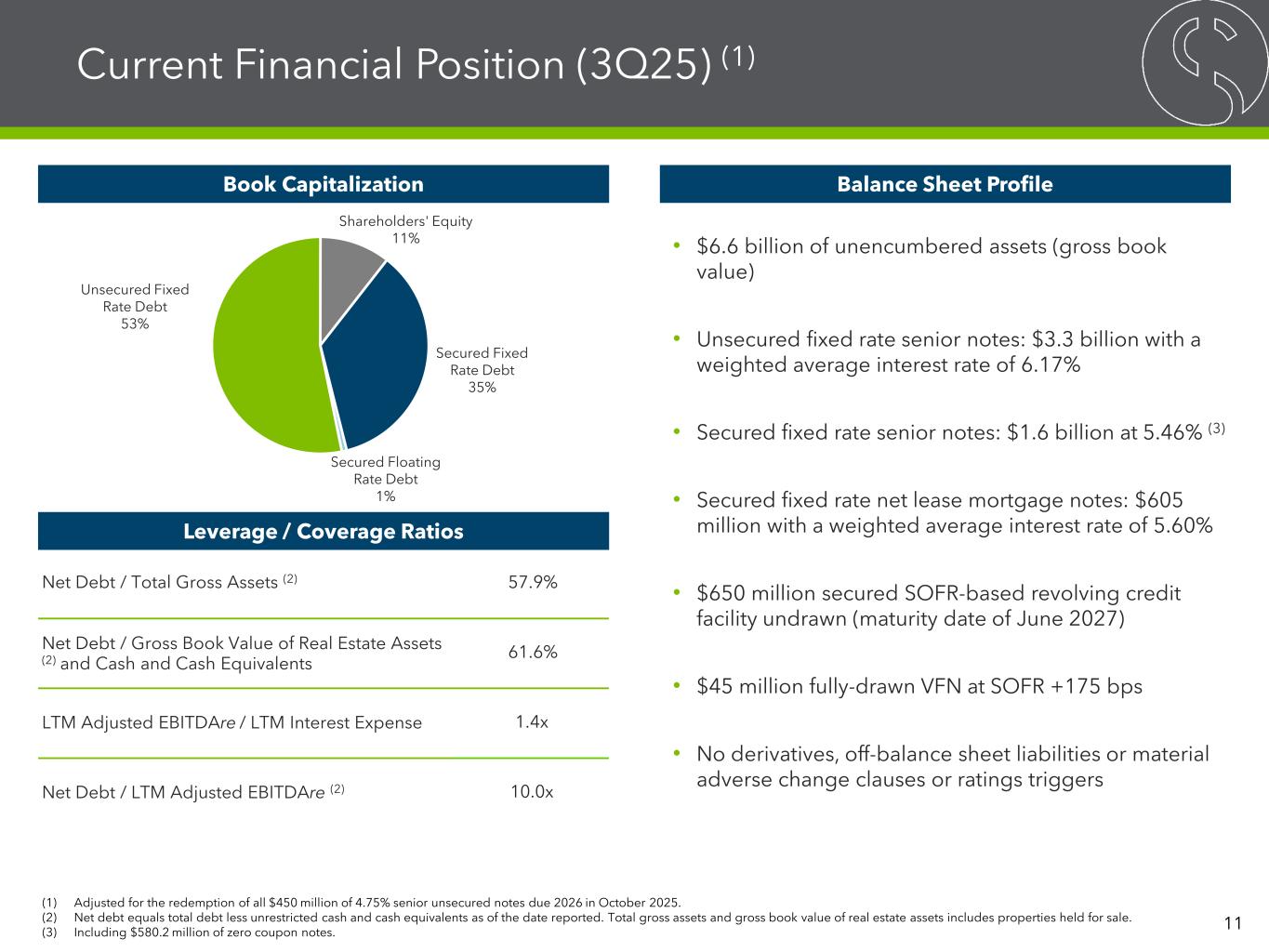 Current Financial Position (3Q25) (1) Net Debt / Total Gross Assets (2) 57.9% Net Debt / Gross Book Value of Real Estate Assets (2) and Cash and Cash Equivalents 61.6% LTM Adjusted EBITDAre / LTM Interest Expense 1.4x Net Debt / LTM Adjusted EBITDAre (2) 10.0x (1) Adjusted for the redemption of all $450 million of 4.75% senior unsecured notes due 2026 in October 2025. (2) Net debt equals total debt less unrestricted cash and cash equivalents as of the date reported. Total gross assets and gross book value of real estate assets includes properties held for sale. (3) Including $580.2 million of zero coupon notes. Secured Fixed Rate Debt 35% Secured Floating Rate Debt 1% Unsecured Fixed Rate Debt 53% Shareholders' Equity 11% • $6.6 billion of unencumbered assets (gross book value) • Unsecured fixed rate senior notes: $3.3 billion with a weighted average interest rate of 6.17% • Secured fixed rate senior notes: $1.6 billion at 5.46% (3) • Secured fixed rate net lease mortgage notes: $605 million with a weighted average interest rate of 5.60% • $650 million secured SOFR-based revolving credit facility undrawn (maturity date of June 2027) • $45 million fully-drawn VFN at SOFR +175 bps • No derivatives, off-balance sheet liabilities or material adverse change clauses or ratings triggers Book Capitalization Balance Sheet Profile Leverage / Coverage Ratios 11