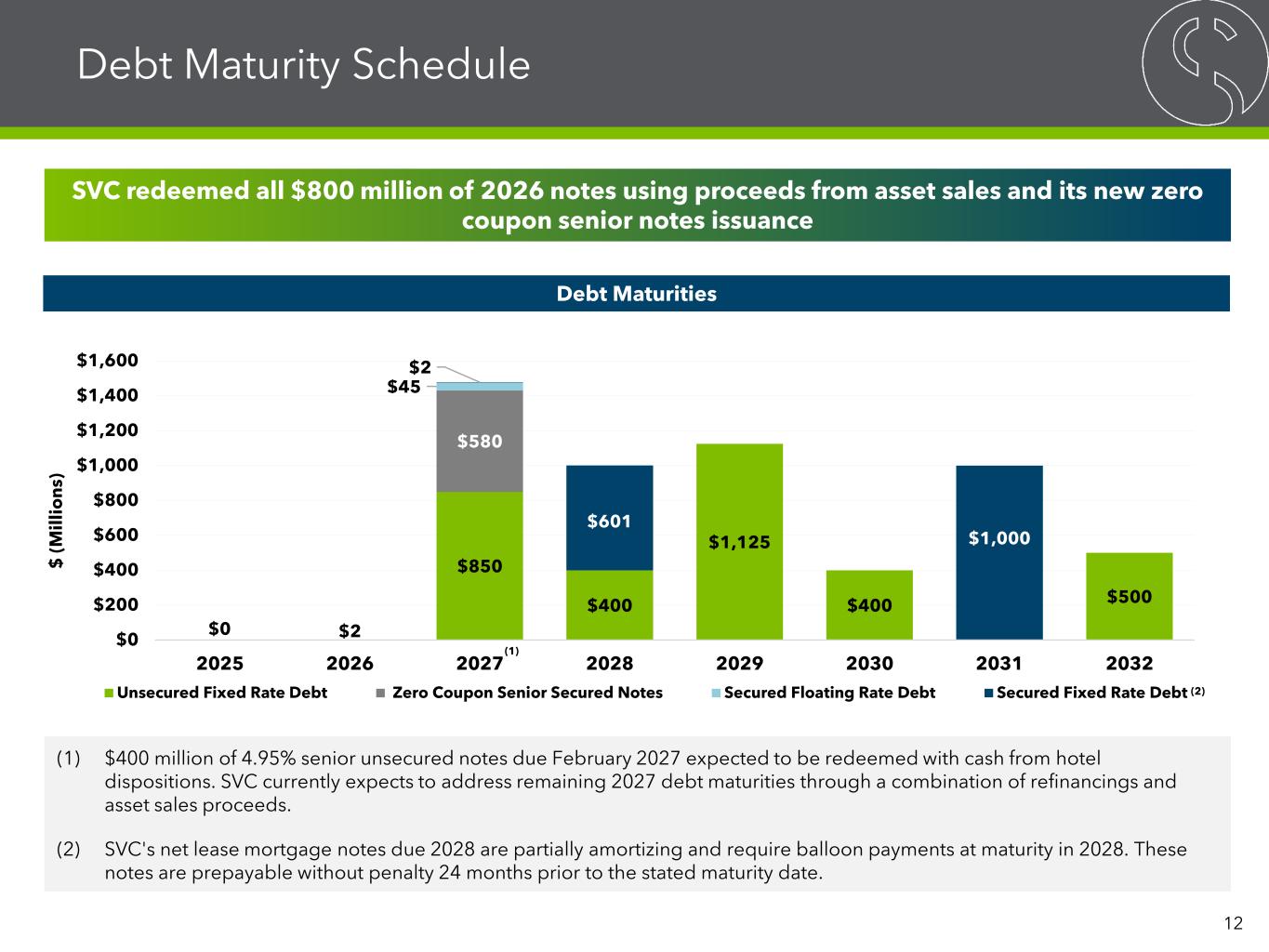 Debt Maturity Schedule Debt Maturities $850 $400 $1,125 $400 $500 $580 $45 $2 $2 $601 $1,000 $0 $200 $400 $600 $800 $1,000 $1,200 $1,400 $1,600 2025 2026 2027 2028 2029 2030 2031 2032 $ (M ill io n s) Unsecured Fixed Rate Debt Zero Coupon Senior Secured Notes Secured Floating Rate Debt Secured Fixed Rate Debt (1) (1) $400 million of 4.95% senior unsecured notes due February 2027 expected to be redeemed with cash from hotel dispositions. SVC currently expects to address remaining 2027 debt maturities through a combination of refinancings and asset sales proceeds. (2) SVC's net lease mortgage notes due 2028 are partially amortizing and require balloon payments at maturity in 2028. These notes are prepayable without penalty 24 months prior to the stated maturity date. $0 12 (2) SVC redeemed all $800 million of 2026 notes using proceeds from asset sales and its new zero coupon senior notes issuance