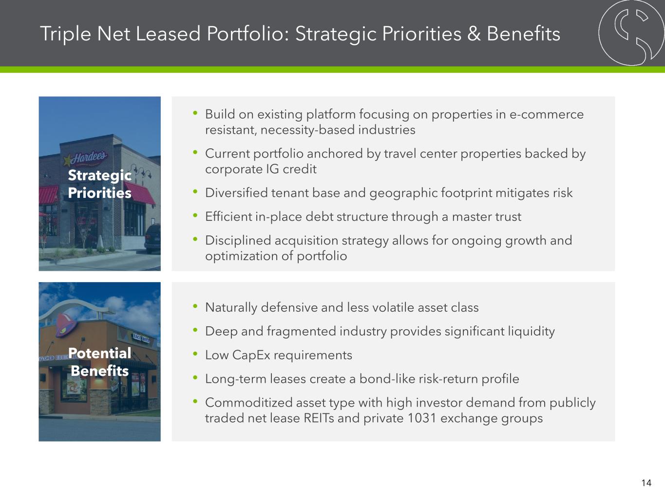 Strategic Priorities Potential Benefits Triple Net Leased Portfolio: Strategic Priorities & Benefits • Build on existing platform focusing on properties in e-commerce resistant, necessity-based industries • Current portfolio anchored by travel center properties backed by corporate IG credit • Diversified tenant base and geographic footprint mitigates risk • Efficient in-place debt structure through a master trust • Disciplined acquisition strategy allows for ongoing growth and optimization of portfolio • Naturally defensive and less volatile asset class • Deep and fragmented industry provides significant liquidity • Low CapEx requirements • Long-term leases create a bond-like risk-return profile • Commoditized asset type with high investor demand from publicly traded net lease REITs and private 1031 exchange groups 14