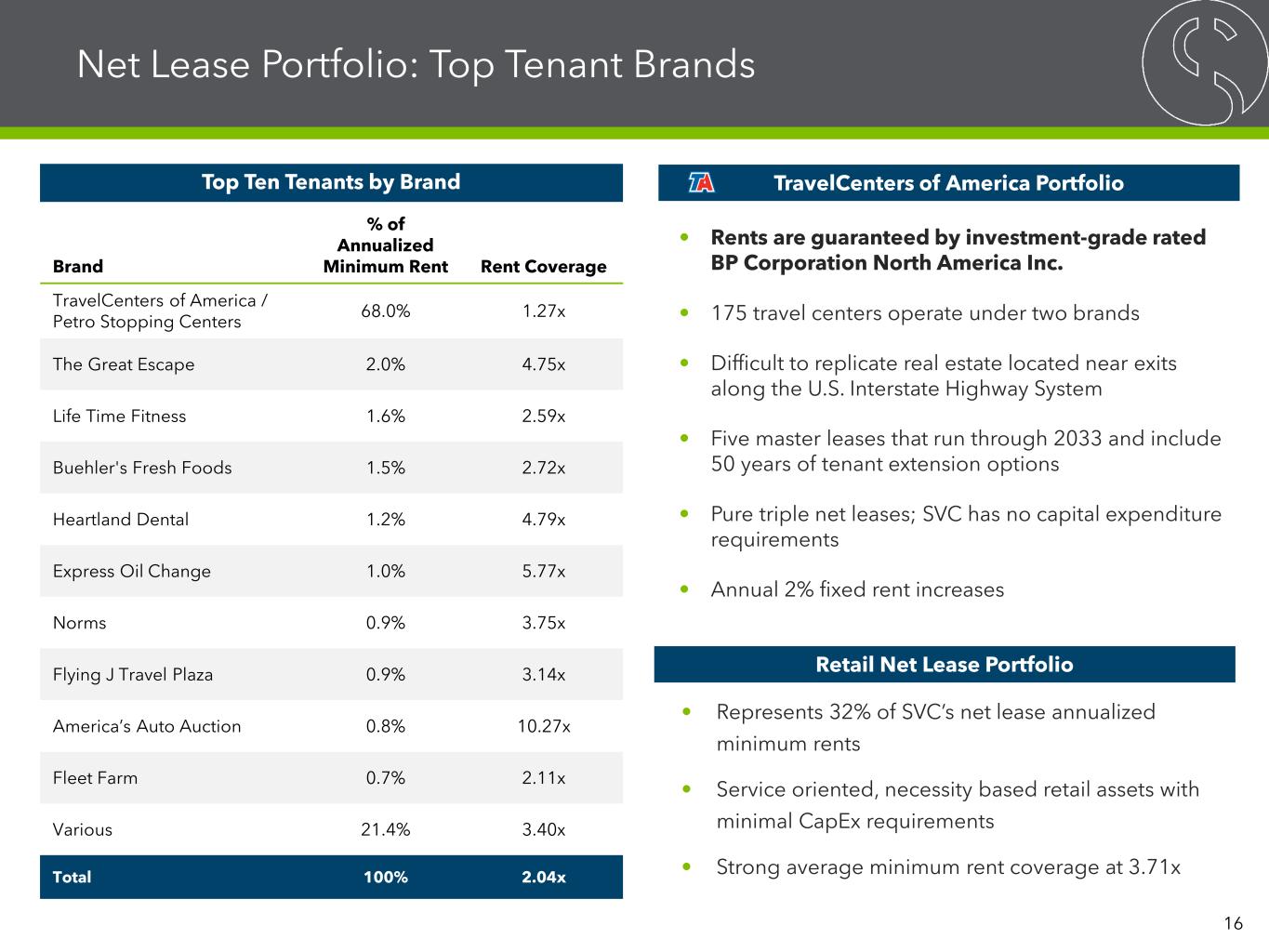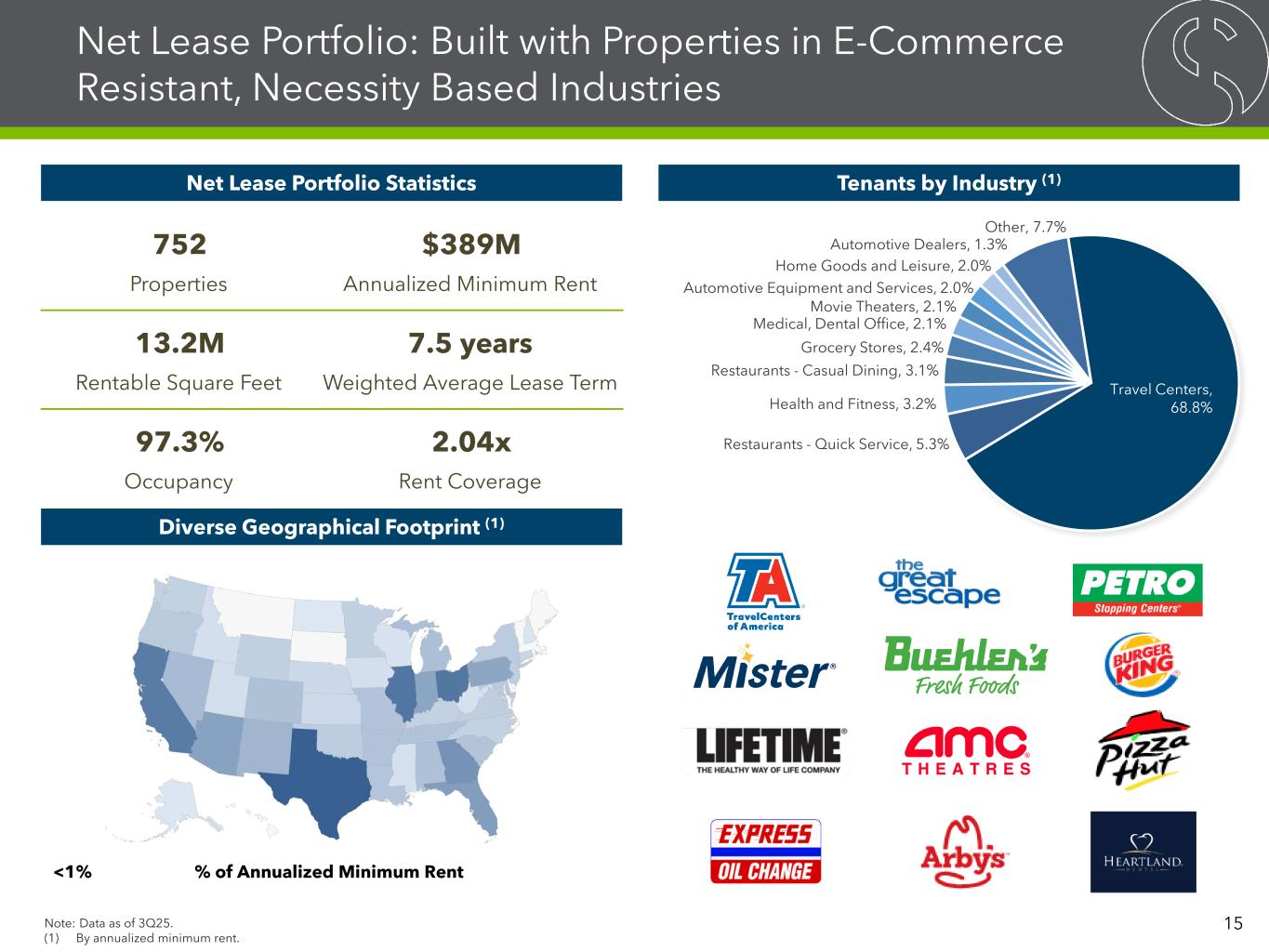 Note: Data as of 3Q25. (1) By annualized minimum rent. Travel Centers, 68.8% Restaurants - Quick Service, 5.3% Health and Fitness, 3.2% Restaurants - Casual Dining, 3.1% Grocery Stores, 2.4% Medical, Dental Office, 2.1% Movie Theaters, 2.1% Automotive Equipment and Services, 2.0% Home Goods and Leisure, 2.0% Automotive Dealers, 1.3% Other, 7.7% Net Lease Portfolio: Built with Properties in E-Commerce Resistant, Necessity Based Industries 752 $389M Properties Annualized Minimum Rent 13.2M 7.5 years Rentable Square Feet Weighted Average Lease Term 97.3% 2.04x Occupancy Rent Coverage % of Annualized Minimum Rent<1% >9.0% Diverse Geographical Footprint (1) Net Lease Portfolio Statistics Tenants by Industry (1) 15