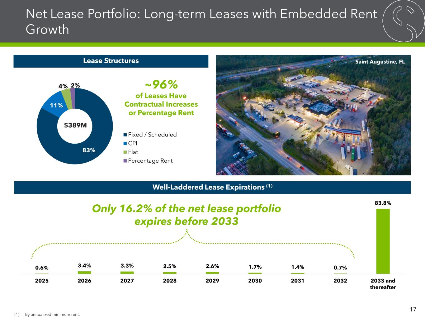 83% 11% 4% 2% Fixed / Scheduled CPI Flat Percentage Rent Net Lease Portfolio: Long-term Leases with Embedded Rent Growth Well-Laddered Lease Expirations (1) ~96% of Leases Have Contractual Increases or Percentage Rent Lease Structures $389M 0.6% 3.4% 3.3% 2.5% 2.6% 1.7% 1.4% 0.7% 83.8% 2025 2026 2027 2028 2029 2030 2031 2032 2033 and thereafter Only 16.2% of the net lease portfolio expires before 2033 (1) By annualized minimum rent. 17 Saint Augustine, FL