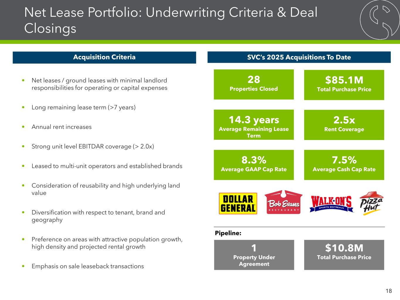 Net Lease Portfolio: Underwriting Criteria & Deal Closings SVC’s 2025 Acquisitions To Date • Net leases / ground leases with minimal landlord responsibilities for operating or capital expenses • Long remaining lease term (>7 years) • Annual rent increases • Strong unit level EBITDAR coverage (> 2.0x) • Leased to multi-unit operators and established brands • Consideration of reusability and high underlying land value • Diversification with respect to tenant, brand and geography • Preference on areas with attractive population growth, high density and projected rental growth • Emphasis on sale leaseback transactions 28 Properties Closed $85.1M Total Purchase Price 14.3 years Average Remaining Lease Term 2.5x Rent Coverage 8.3% Average GAAP Cap Rate 7.5% Average Cash Cap Rate Pipeline: 1 Property Under Agreement $10.8M Total Purchase Price 18 Acquisition Criteria