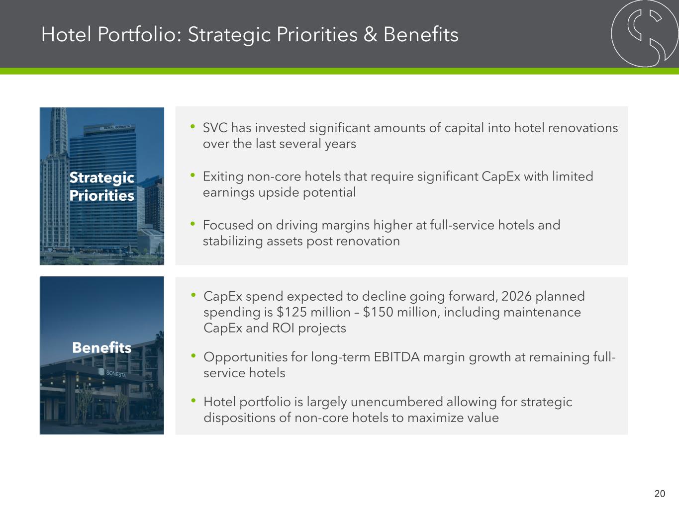 Warning Concerning Forward-Looking Statements, Disclaimers and Non-GAAP Financial Measures This presentation contains forward-looking statements within the meaning of the Private Securities Litigation Reform Act of 1995 and other securities laws that are subject to risks and uncertainties. These statements may include words such as “believe”, “expect”, “anticipate”, “intend”, “plan”, “estimate”, “will”, “may” and negatives or derivatives of these or similar expressions. These forward-looking statements include, among others, statements about: SVC’s ability to generate consistent cash flows and embedded growth, SVC’s contemplated disposition program (and the expected impacts thereof and pro forma information related thereto), SVC’s ability to rebalance its hotel portfolio towards full-service urban and leisure-oriented properties through asset sales and the future composition of its portfolio, SVC’s ability to strengthen its balance sheet and reduce leverage through its planned sales of hotels, SVC’s expectation and ability to reduce capital expenditures and future capital expenditures guidance, SVC’s ability to expand its earnings before interest, taxes, depreciation and amortization, or EBITDA, margin, SVC’s expected use of proceeds from asset sales, SVC’s pending net lease acquisitions, SVC’s ability to redeem its senior unsecured notes and repay its debt financings, and SVC’s renovation and redevelopment initiatives, disciplined acquisition strategy, strategic transformation benefits and key priorities. Forward-looking statements reflect SVC’s current expectations, are based on judgments and assumptions, are inherently uncertain and are subject to risks, uncertainties and other factors, which could cause SVC’s actual results, performance or achievements to differ materially from expected future results, performance or achievements expressed or implied in those forward-looking statements. Some of the risks, uncertainties and other factors that may cause SVC’s actual results, performance or achievements to differ materially from those expressed or implied by forward-looking statements include, but are not limited to, the following: the ability of Sonesta International Hotels Corporation, or collectively with its parent and subsidiaries, Sonesta, to successfully operate the hotels it manages for SVC; SVC’s ability and the ability of SVC’s managers and tenants to operate under unfavorable market and commercial real estate industry conditions due to, among other things, uncertainties surrounding interest rates and inflation, supply chain disruptions, emerging technologies, volatility in the public equity and debt markets, effect of or changes to tariffs or trading policies, pandemics, geopolitical instability and tensions, economic downturns or a possible recession, labor market conditions or changes in real estate utilization; SVC’s ability to sell properties at prices it targets, and the timing of such sales; SVC’s ability to repay or refinance its debts as they mature or otherwise become due; SVC’s ability to maintain sufficient liquidity, including the availability of borrowings under its revolving credit facility and the variable funding note, or VFN; SVC’s ability to pay interest on and principal of its debt; the impact of changes in U.S. and foreign government administrative policies, including the imposition of or increases in tariffs and changes to existing trade agreements, on macroeconomic conditions, supply chains and the cost of products SVC’s operators use, and on the results of operations of SVC’s operators and SVC; whether and the extent to which SVC’s managers and tenants will pay the contractual amounts of returns, rents or other obligations due to SVC; competition within the commercial real estate, hotel, transportation and travel center and other industries in which SVC’s managers and tenants operate, particularly in those markets in which SVC’s properties are located; SVC’s ability to make cost-effective improvements to SVC’s properties that enhance their appeal to hotel guests and net lease tenants; SVC’s ability to pay distributions to its shareholders and to increase or sustain the amount of such distributions; SVC’s ability to acquire properties that realize its targeted returns; SVC’s ability to identify properties that it wants to acquire or to negotiate acceptable purchase prices, acquisition financing terms, management agreements or lease terms for new properties, or ability to complete acquisitions; SVC’s ability to raise or appropriately balance the use of debt or equity capital; potential defaults under SVC’s management agreements and leases by its managers and tenants; SVC’s ability to increase hotel room rates and rents at its net leased properties as SVC’s leases expire in excess of its operating expenses and to grow its business; SVC’s ability to increase and maintain hotel room and net lease property occupancy at its properties; SVC’s ability to engage and retain qualified managers and tenants for its hotels and net lease properties on satisfactory terms; SVC’s ability to diversify its sources of rents and returns that improve the security of its cash flows; SVC’s credit ratings; the ability of SVC’s manager, The RMR Group LLC, or RMR, to successfully manage SVC; actual and potential conflicts of interest with SVC’s related parties, including its Managing Trustees, Sonesta, RMR and others affiliated with them; SVC’s ability to realize benefits from the scale, geographic diversity, strategic locations and variety of service levels of its hotels; limitations imposed by and SVC’s ability to satisfy complex rules to maintain its qualification for taxation as a real estate investment trust, or REIT, for U.S. federal income tax purposes; compliance with, and changes to, federal, state and local laws and regulations, accounting rules, tax laws and 