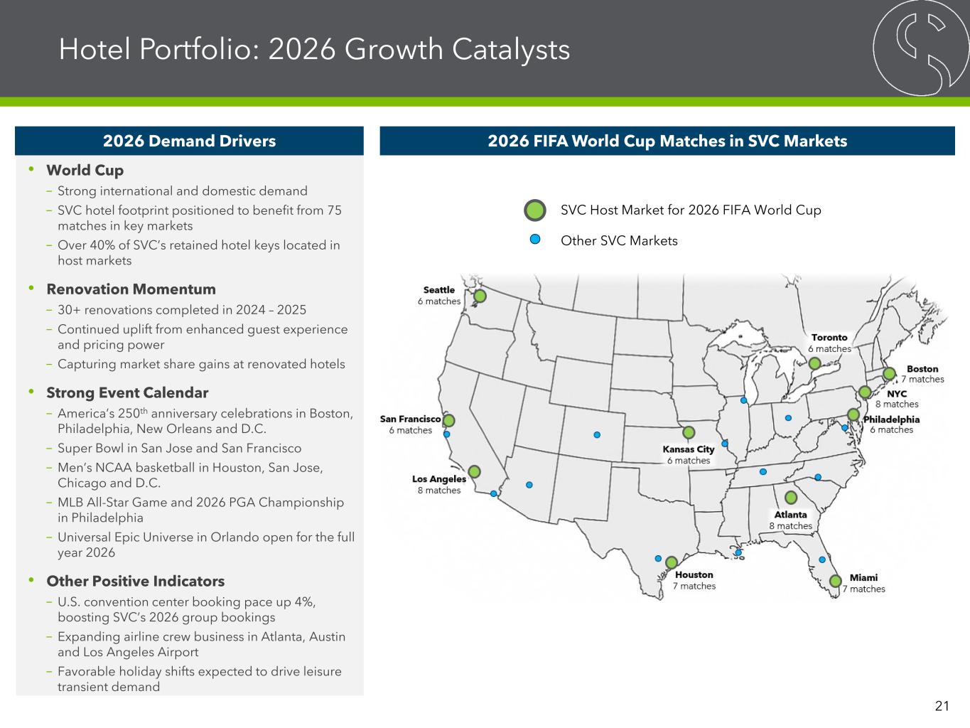 Benefits Strategic Priorities Hotel Portfolio: Strategic Priorities & Benefits • SVC has invested significant amounts of capital into hotel renovations over the last several years • Exiting non-core hotels that require significant CapEx with limited earnings upside potential • Focused on driving margins higher at full-service hotels and stabilizing assets post renovation • CapEx spend expected to decline going forward, 2026 planned spending is $125 million – $150 million, including maintenance CapEx and ROI projects • Opportunities for long-term EBITDA margin growth at remaining full- service hotels • Hotel portfolio is largely unencumbered allowing for strategic dispositions of non-core hotels to maximize value 20