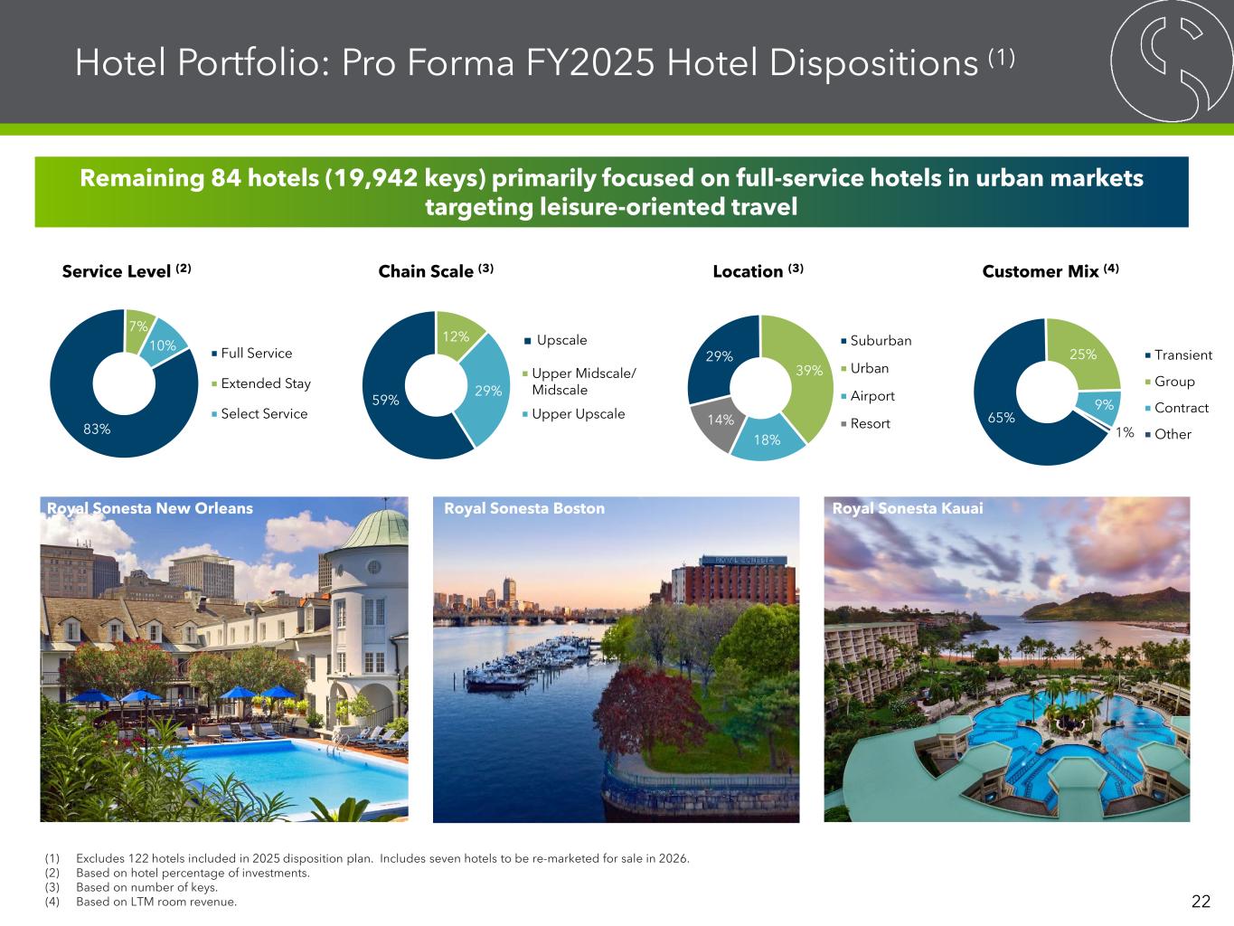 Warning Concerning Forward-Looking Statements, Disclaimers and Non-GAAP Financial Measures This presentation contains forward-looking statements within the meaning of the Private Securities Litigation Reform Act of 1995 and other securities laws that are subject to risks and uncertainties. These statements may include words such as “believe”, “expect”, “anticipate”, “intend”, “plan”, “estimate”, “will”, “may” and negatives or derivatives of these or similar expressions. These forward-looking statements include, among others, statements about: SVC’s ability to generate consistent cash flows and embedded growth, SVC’s contemplated disposition program (and the expected impacts thereof and pro forma information related thereto), SVC’s ability to rebalance its hotel portfolio towards full-service urban and leisure-oriented properties through asset sales and the future composition of its portfolio, SVC’s ability to strengthen its balance sheet and reduce leverage through its planned sales of hotels, SVC’s expectation and ability to reduce capital expenditures and future capital expenditures guidance, SVC’s ability to expand its earnings before interest, taxes, depreciation and amortization, or EBITDA, margin, SVC’s expected use of proceeds from asset sales, SVC’s pending net lease acquisitions, SVC’s ability to redeem its senior unsecured notes and repay its debt financings, and SVC’s renovation and redevelopment initiatives, disciplined acquisition strategy, strategic transformation benefits and key priorities. Forward-looking statements reflect SVC’s current expectations, are based on judgments and assumptions, are inherently uncertain and are subject to risks, uncertainties and other factors, which could cause SVC’s actual results, performance or achievements to differ materially from expected future results, performance or achievements expressed or implied in those forward-looking statements. Some of the risks, uncertainties and other factors that may cause SVC’s actual results, performance or achievements to differ materially from those expressed or implied by forward-looking statements include, but are not limited to, the following: the ability of Sonesta International Hotels Corporation, or collectively with its parent and subsidiaries, Sonesta, to successfully operate the hotels it manages for SVC; SVC’s ability and the ability of SVC’s managers and tenants to operate under unfavorable market and commercial real estate industry conditions due to, among other things, uncertainties surrounding interest rates and inflation, supply chain disruptions, emerging technologies, volatility in the public equity and debt markets, effect of or changes to tariffs or trading policies, pandemics, geopolitical instability and tensions, economic downturns or a possible recession, labor market conditions or changes in real estate utilization; SVC’s ability to sell properties at prices it targets, and the timing of such sales; SVC’s ability to repay or refinance its debts as they mature or otherwise become due; SVC’s ability to maintain sufficient liquidity, including the availability of borrowings under its revolving credit facility and the variable funding note, or VFN; SVC’s ability to pay interest on and principal of its debt; the impact of changes in U.S. and foreign government administrative policies, including the imposition of or increases in tariffs and changes to existing trade agreements, on macroeconomic conditions, supply chains and the cost of products SVC’s operators use, and on the results of operations of SVC’s operators and SVC; whether and the extent to which SVC’s managers and tenants will pay the contractual amounts of returns, rents or other obligations due to SVC; competition within the commercial real estate, hotel, transportation and travel center and other industries in which SVC’s managers and tenants operate, particularly in those markets in which SVC’s properties are located; SVC’s ability to make cost-effective improvements to SVC’s properties that enhance their appeal to hotel guests and net lease tenants; SVC’s ability to pay distributions to its shareholders and to increase or sustain the amount of such distributions; SVC’s ability to acquire properties that realize its targeted returns; SVC’s ability to identify properties that it wants to acquire or to negotiate acceptable purchase prices, acquisition financing terms, management agreements or lease terms for new properties, or ability to complete acquisitions; SVC’s ability to raise or appropriately balance the use of debt or equity capital; potential defaults under SVC’s management agreements and leases by its managers and tenants; SVC’s ability to increase hotel room rates and rents at its net leased properties as SVC’s leases expire in excess of its operating expenses and to grow its business; SVC’s ability to increase and maintain hotel room and net lease property occupancy at its properties; SVC’s ability to engage and retain qualified managers and tenants for its hotels and net lease properties on satisfactory terms; SVC’s ability to diversify its sources of rents and returns that improve the security of its cash flows; SVC’s credit ratings; the ability of SVC’s manager, The RMR Group LLC, or RMR, to successfully manage SVC; actual and potential conflicts of interest with SVC’s related parties, including its Managing Trustees, Sonesta, RMR and others affiliated with them; SVC’s ability to realize benefits from the scale, geographic diversity, strategic locations and variety of service levels of its hotels; limitations imposed by and SVC’s ability to satisfy complex rules to maintain its qualification for taxation as a real estate investment trust, or REIT, for U.S. federal income tax purposes; compliance with, and changes to, federal, state and local laws and regulations, accounting rules, tax laws and 