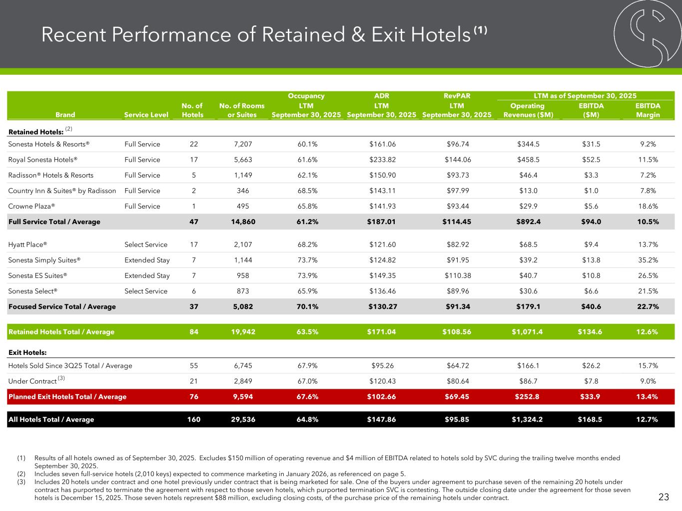 Occupancy ADR RevPAR LTM as of September 30, 2025 No. of No. of Rooms LTM LTM LTM Operating EBITDA EBITDA Brand Service Level Hotels or Suites September 30, 2025 September 30, 2025 September 30, 2025 Revenues ($M) ($M) Margin Retained Hotels: Sonesta Hotels & Resorts® Full Service 22 7,207 60.1% $161.06 $96.74 $344.5 $31.5 9.2% Royal Sonesta Hotels® Full Service 17 5,663 61.6% $233.82 $144.06 $458.5 $52.5 11.5% Radisson® Hotels & Resorts Full Service 5 1,149 62.1% $150.90 $93.73 $46.4 $3.3 7.2% Country Inn & Suites® by Radisson Full Service 2 346 68.5% $143.11 $97.99 $13.0 $1.0 7.8% Crowne Plaza® Full Service 1 495 65.8% $141.93 $93.44 $29.9 $5.6 18.6% Full Service Total / Average 47 14,860 61.2% $187.01 $114.45 $892.4 $94.0 10.5% Hyatt Place® Select Service 17 2,107 68.2% $121.60 $82.92 $68.5 $9.4 13.7% Sonesta Simply Suites® Extended Stay 7 1,144 73.7% $124.82 $91.95 $39.2 $13.8 35.2% Sonesta ES Suites® Extended Stay 7 958 73.9% $149.35 $110.38 $40.7 $10.8 26.5% Sonesta Select® Select Service 6 873 65.9% $136.46 $89.96 $30.6 $6.6 21.5% Focused Service Total / Average 37 5,082 70.1% $130.27 $91.34 $179.1 $40.6 22.7% Retained Hotels Total / Average 84 19,942 63.5% $171.04 $108.56 $1,071.4 $134.6 12.6% Exit Hotels: Hotels Sold Since 3Q25 Total / Average 55 6,745 67.9% $95.26 $64.72 $166.1 $26.2 15.7% Under Contract 21 2,849 67.0% $120.43 $80.64 $86.7 $7.8 9.0% Planned Exit Hotels Total / Average 76 9,594 67.6% $102.66 $69.45 $252.8 $33.9 13.4% All Hotels Total / Average 160 29,536 64.8% $147.86 $95.85 $1,324.2 $168.5 12.7% Recent Performance of Retained & Exit Hotels 23 (1) Results of all hotels owned as of September 30, 2025. Excludes $150 million of operating revenue and $4 million of EBITDA related to hotels sold by SVC during the trailing twelve months ended September 30, 2025. (2) Includes seven full-service hotels (2,010 keys) expected to commence marketing in January 2026, as referenced on page 5. (3) Includes 20 hotels under contract and one hotel previously under contract that is being marketed for sale. One of the buyers under agreement to purchase seven of the remaining 20 hotels under contract has purported to terminate the agreement with respect to those seven hotels, which purported termination SVC is contesting. The outside closing date under the agreement for those seven hotels is December 15, 2025. Those seven hotels represent $88 million, excluding closing costs, of the purchase price of the remaining hotels under contract. (2) (1) (3)