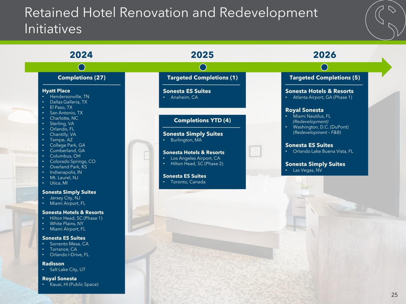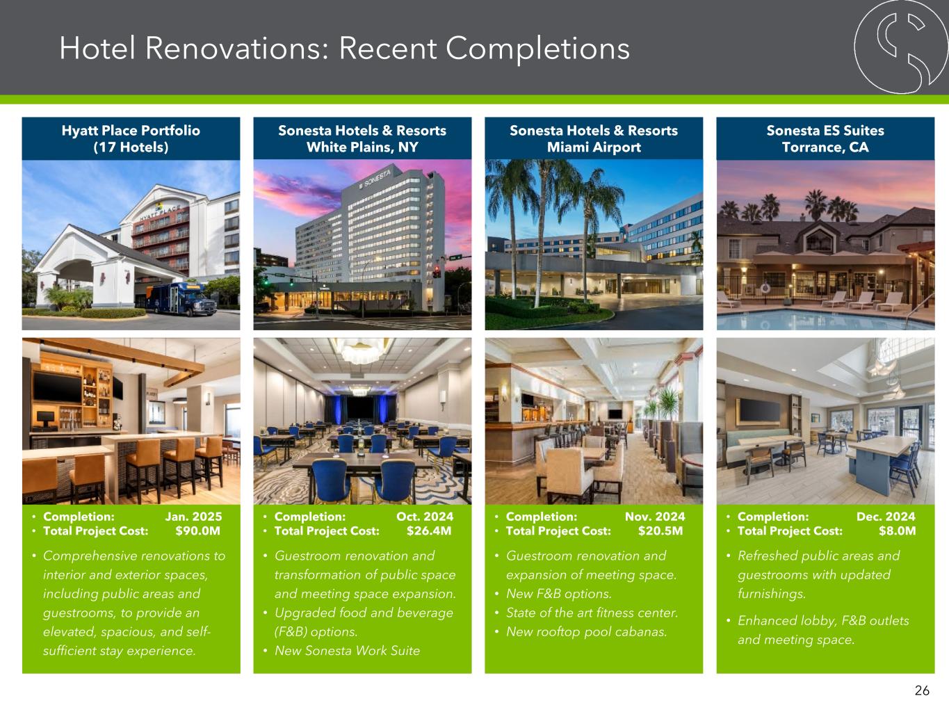 Retained Hotel Renovation and Redevelopment Initiatives 2024 2025 2026 Targeted Completions (5) Sonesta Hotels & Resorts • Atlanta Airport, GA (Phase 1) Royal Sonesta • Miami Nautilus, FL (Redevelopment) • Washington, D.C. (DuPont) (Redevelopment – F&B) Sonesta ES Suites • Orlando Lake Buena Vista, FL Sonesta Simply Suites • Las Vegas, NV Completions (27) Hyatt Place • Hendersonville, TN • Dallas Galleria, TX • El Paso, TX • San Antonio, TX • Charlotte, NC • Sterling, VA • Orlando, FL • Chantilly, VA • Tempe, AZ • College Park, GA • Cumberland, GA • Columbus, OH • Colorado Springs, CO • Overland Park, KS • Indianapolis, IN • Mt. Laurel, NJ • Utica, MI Sonesta Simply Suites • Jersey City, NJ • Miami Airport, FL Sonesta Hotels & Resorts • Hilton Head, SC (Phase 1) • White Plains, NY • Miami Airport, FL Sonesta ES Suites • Sorrento Mesa, CA • Torrance, CA • Orlando I-Drive, FL Radisson • Salt Lake City, UT Royal Sonesta • Kauai, HI (Public Space) Targeted Completions (1) Sonesta ES Suites • Anaheim, CA Completions YTD (4) Sonesta Simply Suites • Burlington, MA Sonesta Hotels & Resorts • Los Angeles Airport, CA • Hilton Head, SC (Phase 2) Sonesta ES Suites • Toronto, Canada 25