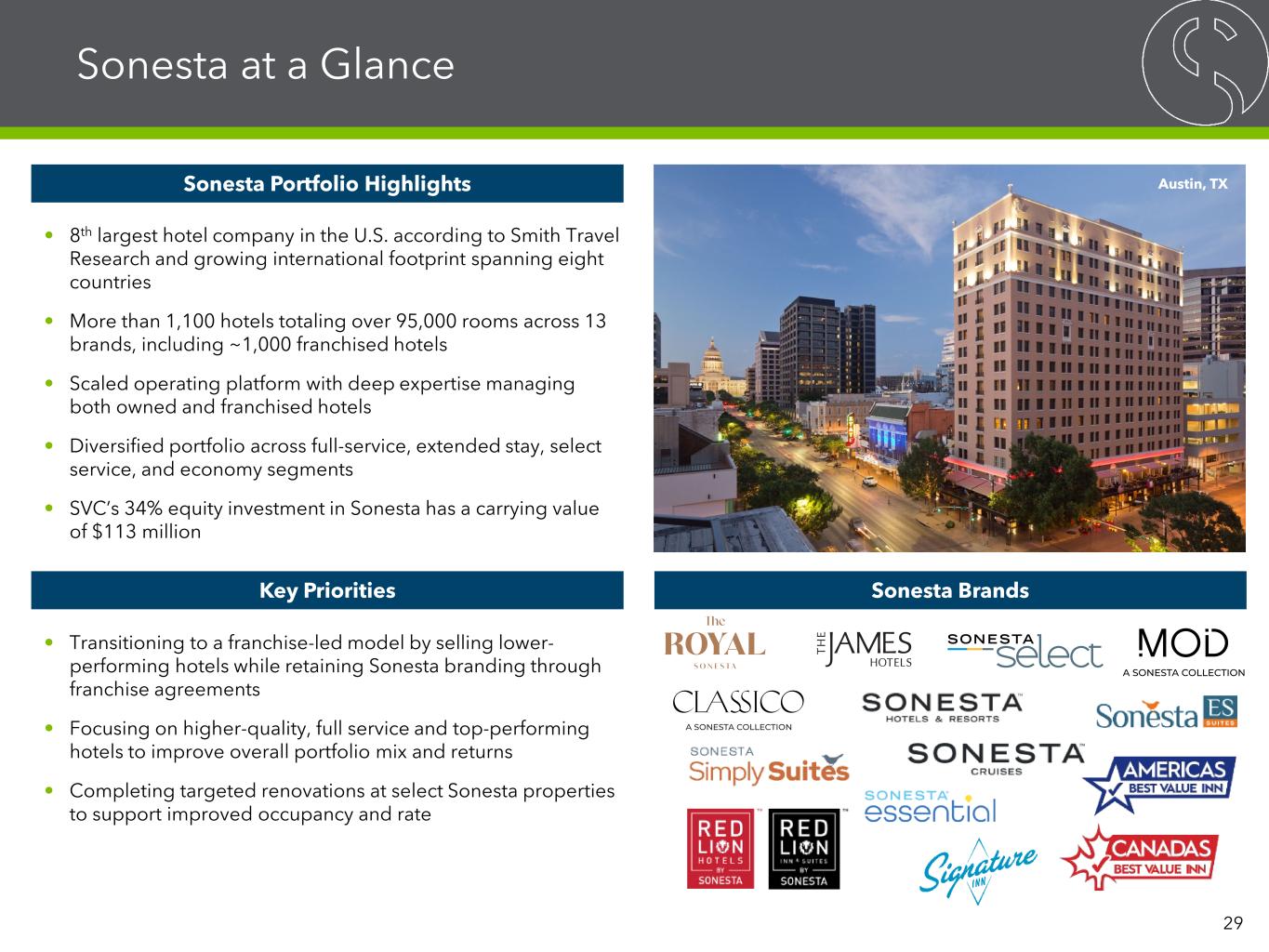 Sonesta at a Glance • 8th largest hotel company in the U.S. according to Smith Travel Research and growing international footprint spanning eight countries • More than 1,100 hotels totaling over 95,000 rooms across 13 brands, including ~1,000 franchised hotels • Scaled operating platform with deep expertise managing both owned and franchised hotels • Diversified portfolio across full-service, extended stay, select service, and economy segments • SVC’s 34% equity investment in Sonesta has a carrying value of $113 million Sonesta Portfolio Highlights Sonesta BrandsKey Priorities • Transitioning to a franchise-led model by selling lower- performing hotels while retaining Sonesta branding through franchise agreements • Focusing on higher-quality, full service and top-performing hotels to improve overall portfolio mix and returns • Completing targeted renovations at select Sonesta properties to support improved occupancy and rate Austin, TX 29