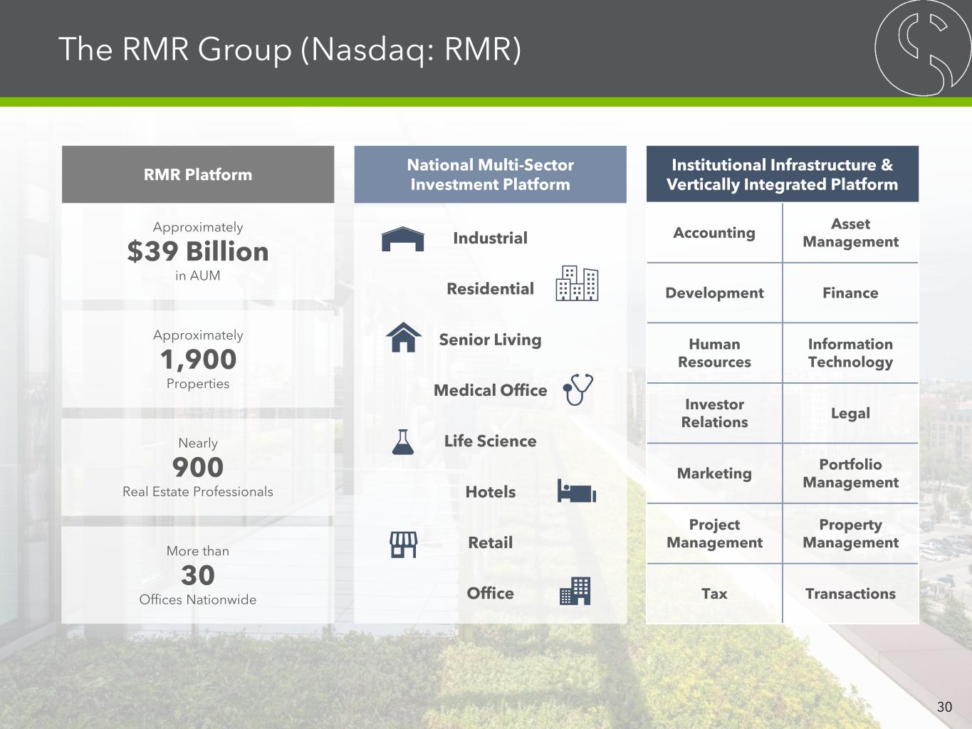 Approximately $39 Billion in AUM RMR Platform Approximately 1,900 Properties More than 30 Offices Nationwide National Multi-Sector Investment Platform Industrial Residential Senior Living Medical Office Life Science Hotels Retail Office Nearly 900 Real Estate Professionals Institutional Infrastructure & Vertically Integrated Platform Accounting Asset Management Development Finance Human Resources Information Technology Investor Relations Legal Marketing Portfolio Management Project Management Property Management Tax Transactions The RMR Group (Nasdaq: RMR) 30