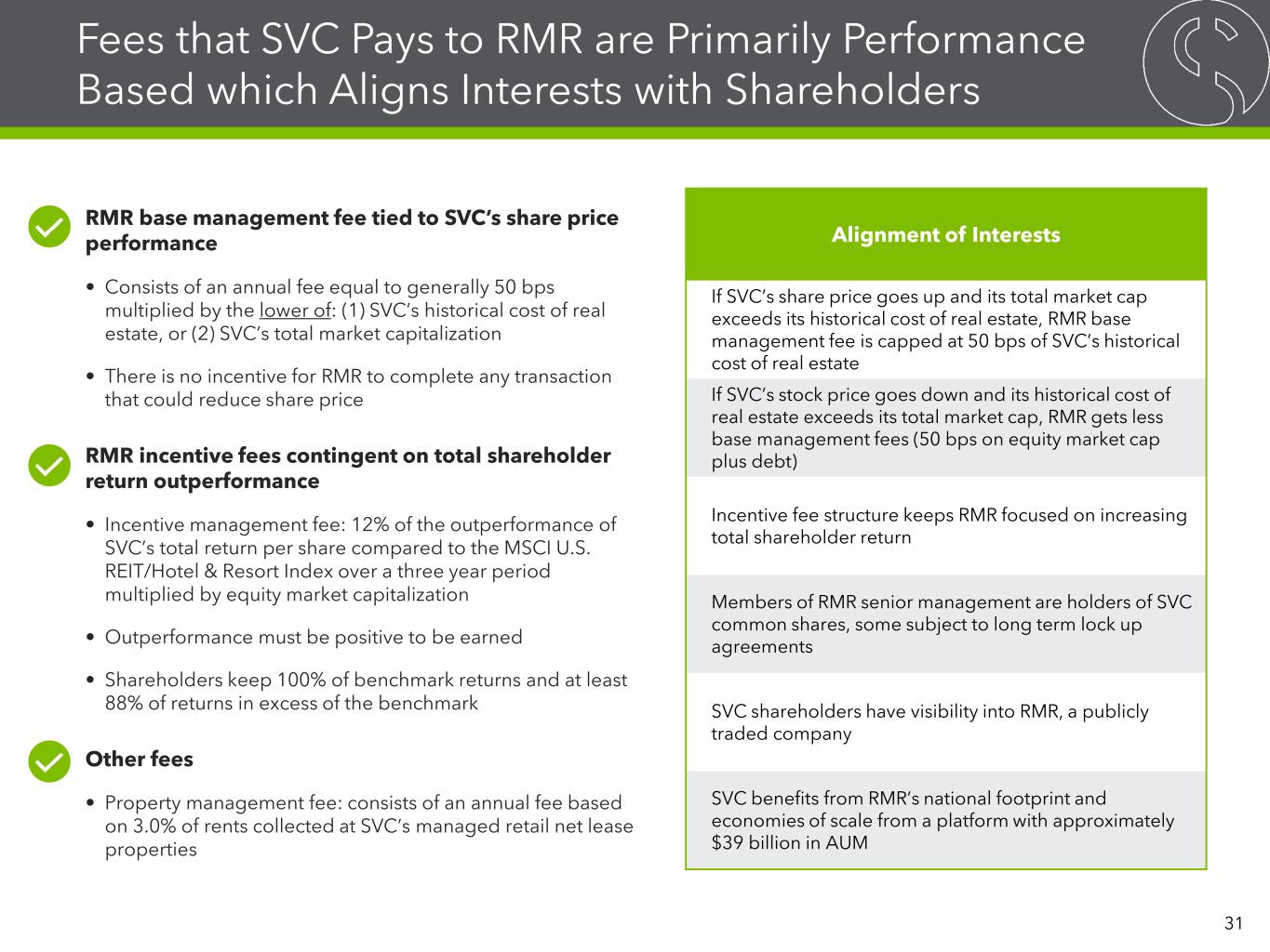 Fees that SVC Pays to RMR are Primarily Performance Based which Aligns Interests with Shareholders RMR base management fee tied to SVC’s share price performance • Consists of an annual fee equal to generally 50 bps multiplied by the lower of: (1) SVC’s historical cost of real estate, or (2) SVC’s total market capitalization • There is no incentive for RMR to complete any transaction that could reduce share price RMR incentive fees contingent on total shareholder return outperformance • Incentive management fee: 12% of the outperformance of SVC’s total return per share compared to the MSCI U.S. REIT/Hotel & Resort Index over a three year period multiplied by equity market capitalization • Outperformance must be positive to be earned • Shareholders keep 100% of benchmark returns and at least 88% of returns in excess of the benchmark Other fees • Property management fee: consists of an annual fee based on 3.0% of rents collected at SVC’s managed retail net lease properties Alignment of Interests If SVC’s share price goes up and its total market cap exceeds its historical cost of real estate, RMR base management fee is capped at 50 bps of SVC’s historical cost of real estate If SVC’s stock price goes down and its historical cost of real estate exceeds its total market cap, RMR gets less base management fees (50 bps on equity market cap plus debt) Incentive fee structure keeps RMR focused on increasing total shareholder return Members of RMR senior management are holders of SVC common shares, some subject to long term lock up agreements SVC shareholders have visibility into RMR, a publicly traded company SVC benefits from RMR’s national footprint and economies of scale from a platform with approximately $39 billion in AUM 31