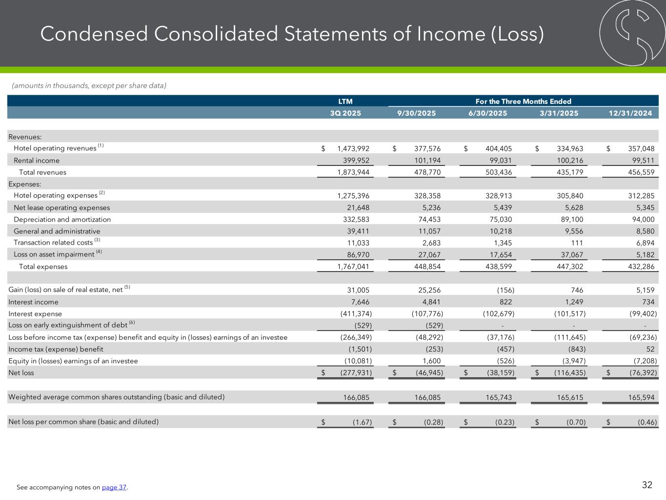 Condensed Consolidated Statements of Income (Loss) 32 (amounts in thousands, except per share data) See accompanying notes on page 37. LTM 3Q 2025 9/30/2025 6/30/2025 3/31/2025 12/31/2024 Revenues: Hotel operating revenues (1) 1,473,992$ 377,576$ 404,405$ 334,963$ 357,048$ Rental income 399,952 101,194 99,031 100,216 99,511 Total revenues 1,873,944 478,770 503,436 435,179 456,559 Expenses: Hotel operating expenses (2) 1,275,396 328,358 328,913 305,840 312,285 Net lease operating expenses 21,648 5,236 5,439 5,628 5,345 Depreciation and amortization 332,583 74,453 75,030 89,100 94,000 General and administrative 39,411 11,057 10,218 9,556 8,580 Transaction related costs (3) 11,033 2,683 1,345 111 6,894 Loss on asset impairment (4) 86,970 27,067 17,654 37,067 5,182 Total expenses 1,767,041 448,854 438,599 447,302 432,286 Gain (loss) on sale of real estate, net (5) 31,005 25,256 (156) 746 5,159 Interest income 7,646 4,841 822 1,249 734 Interest expense (411,374) (107,776) (102,679) (101,517) (99,402) Loss on early extinguishment of debt (6) (529) (529) - - - Loss before income tax (expense) benefit and equity in (losses) earnings of an investee (266,349) (48,292) (37,176) (111,645) (69,236) Income tax (expense) benefit (1,501) (253) (457) (843) 52 Equity in (losses) earnings of an investee (10,081) 1,600 (526) (3,947) (7,208) Net loss (277,931)$ (46,945)$ (38,159)$ (116,435)$ (76,392)$ Weighted average common shares outstanding (basic and diluted) 166,085 166,085 165,743 165,615 165,594 Net loss per common share (basic and diluted) (1.67)$ (0.28)$ (0.23)$ (0.70)$ (0.46)$ For the Three Months Ended