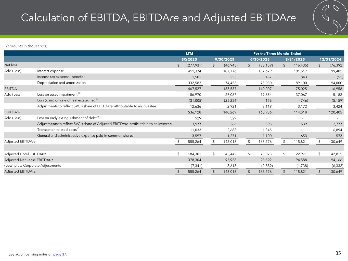 Calculation of FFO, Normalized FFO and CAD 34 (amounts in thousands, except per share data) LTM 3Q 2025 9/30/2025 6/30/2025 3/31/2025 12/31/2024 Net loss (277,931)$ (46,945)$ (38,159)$ (116,435)$ (76,392)$ Add (Less): Depreciation and amortization 332,583 74,453 75,030 89,100 94,000 Loss on asset impairment (4) 86,970 27,067 17,654 37,067 5,182 (Gain) loss on sale of real estate, net (5) (31,005) (25,256) 156 (746) (5,159) Adjustments to reflect SVC's share of FFO attributable to an investee 4,810 1,113 1,182 1,200 1,315 FFO 115,427 30,432 55,863 10,186 18,946 Add (Less): Loss on early extinguishment of debt (6) 529 529 - - - Transaction related costs (3) 11,033 2,683 1,345 111 6,894 Adjustments to reflect SVC's share of Normalized FFO attributable to an investee 3,977 266 395 539 2,777 Normalized FFO 130,966 33,910 57,603 10,836 28,617 Add (Less): Non-cash revenues (44,490) (10,142) (10,624) (12,205) (11,519) Non-cash interest expense 36,031 9,092 9,900 8,680 8,359 Non-cash expenses (2,471) (246) (417) (864) (944) SVC’s share of Normalized FFO attributable to an investee 1,294 (2,979) (1,051) 2,208 3,116 Principal amortization (1,958) (489) (490) (489) (490) Capital expenditures (207,622) (43,746) (38,126) (42,772) (82,978) CAD (88,250)$ (14,600)$ 16,795$ (34,606)$ (55,839)$ Weighted average common shares outstanding (basic and diluted) 166,085 166,085 165,743 165,615 165,594 Basic and diluted per common share amounts: Net loss (1.67)$ (0.28)$ (0.23)$ (0.70)$ (0.46)$ FFO 0.69$ 0.18$ 0.34$ 0.06$ 0.11$ Normalized FFO 0.79$ 0.20$ 0.35$ 0.07$ 0.17$ CAD (0.53)$ (0.09)$ 0.10$ (0.21)$ (0.34)$ For the Three Months Ended See accompanying notes on page 37.