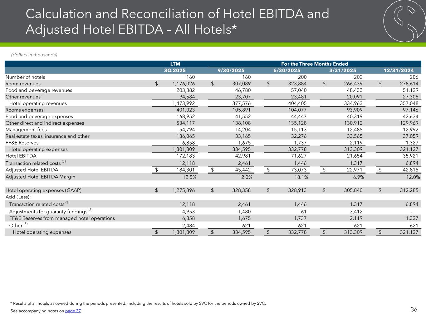 Calculation and Reconciliation of Hotel EBITDA and Adjusted Hotel EBITDA – All Hotels* * Results of all hotels as owned during the periods presented, including the results of hotels sold by SVC for the periods owned by SVC. 36 (dollars in thousands) LTM 3Q 2025 9/30/2025 6/30/2025 3/31/2025 12/31/2024 Number of hotels 160 160 200 202 206 Room revenues 1,176,026$ 307,089$ 323,884$ 266,439$ 278,614$ Food and beverage revenues 203,382 46,780 57,040 48,433 51,129 Other revenues 94,584 23,707 23,481 20,091 27,305 Hotel operating revenues 1,473,992 377,576 404,405 334,963 357,048 Rooms expenses 401,023 105,891 104,077 93,909 97,146 Food and beverage expenses 168,952 41,552 44,447 40,319 42,634 Other direct and indirect expenses 534,117 138,108 135,128 130,912 129,969 Management fees 54,794 14,204 15,113 12,485 12,992 Real estate taxes, insurance and other 136,065 33,165 32,276 33,565 37,059 FF&E Reserves 6,858 1,675 1,737 2,119 1,327 Hotel operating expenses 1,301,809 334,595 332,778 313,309 321,127 Hotel EBITDA 172,183 42,981 71,627 21,654 35,921 Transaction related costs (3) 12,118 2,461 1,446 1,317 6,894 Adjusted Hotel EBITDA 184,301$ 45,442$ 73,073$ 22,971$ 42,815$ Adjusted Hotel EBITDA Margin 12.5% 12.0% 18.1% 6.9% 12.0% Hotel operating expenses (GAAP) 1,275,396$ 328,358$ 328,913$ 305,840$ 312,285$ Add (Less): Transaction related costs (3) 12,118 2,461 1,446 1,317 6,894 Adjustments for guaranty fundings (2) 4,953 1,480 61 3,412 - FF&E Reserves from managed hotel operations 6,858 1,675 1,737 2,119 1,327 Other (7) 2,484 621 621 621 621 Hotel operating expenses 1,301,809$ 334,595$ 332,778$ 313,309$ 321,127$ For the Three Months Ended See accompanying notes on page 37.