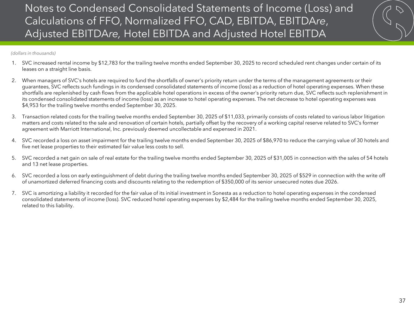 Notes to Condensed Consolidated Statements of Income (Loss) and Calculations of FFO, Normalized FFO, CAD, EBITDA, EBITDAre, Adjusted EBITDAre, Hotel EBITDA and Adjusted Hotel EBITDA 1. SVC increased rental income by $12,783 for the trailing twelve months ended September 30, 2025 to record scheduled rent changes under certain of its leases on a straight line basis. 2. When managers of SVC's hotels are required to fund the shortfalls of owner's priority return under the terms of the management agreements or their guarantees, SVC reflects such fundings in its condensed consolidated statements of income (loss) as a reduction of hotel operating expenses. When these shortfalls are replenished by cash flows from the applicable hotel operations in excess of the owner's priority return due, SVC reflects such replenishment in its condensed consolidated statements of income (loss) as an increase to hotel operating expenses. The net decrease to hotel operating expenses was $4,953 for the trailing twelve months ended September 30, 2025. 3. Transaction related costs for the trailing twelve months ended September 30, 2025 of $11,033, primarily consists of costs related to various labor litigation matters and costs related to the sale and renovation of certain hotels, partially offset by the recovery of a working capital reserve related to SVC’s former agreement with Marriott International, Inc. previously deemed uncollectable and expensed in 2021. 4. SVC recorded a loss on asset impairment for the trailing twelve months ended September 30, 2025 of $86,970 to reduce the carrying value of 30 hotels and five net lease properties to their estimated fair value less costs to sell. 5. SVC recorded a net gain on sale of real estate for the trailing twelve months ended September 30, 2025 of $31,005 in connection with the sales of 54 hotels and 13 net lease properties. 6. SVC recorded a loss on early extinguishment of debt during the trailing twelve months ended September 30, 2025 of $529 in connection with the write off of unamortized deferred financing costs and discounts relating to the redemption of $350,000 of its senior unsecured notes due 2026. 7. SVC is amortizing a liability it recorded for the fair value of its initial investment in Sonesta as a reduction to hotel operating expenses in the condensed consolidated statements of income (loss). SVC reduced hotel operating expenses by $2,484 for the trailing twelve months ended September 30, 2025, related to this liability. 37 (dollars in thousands)