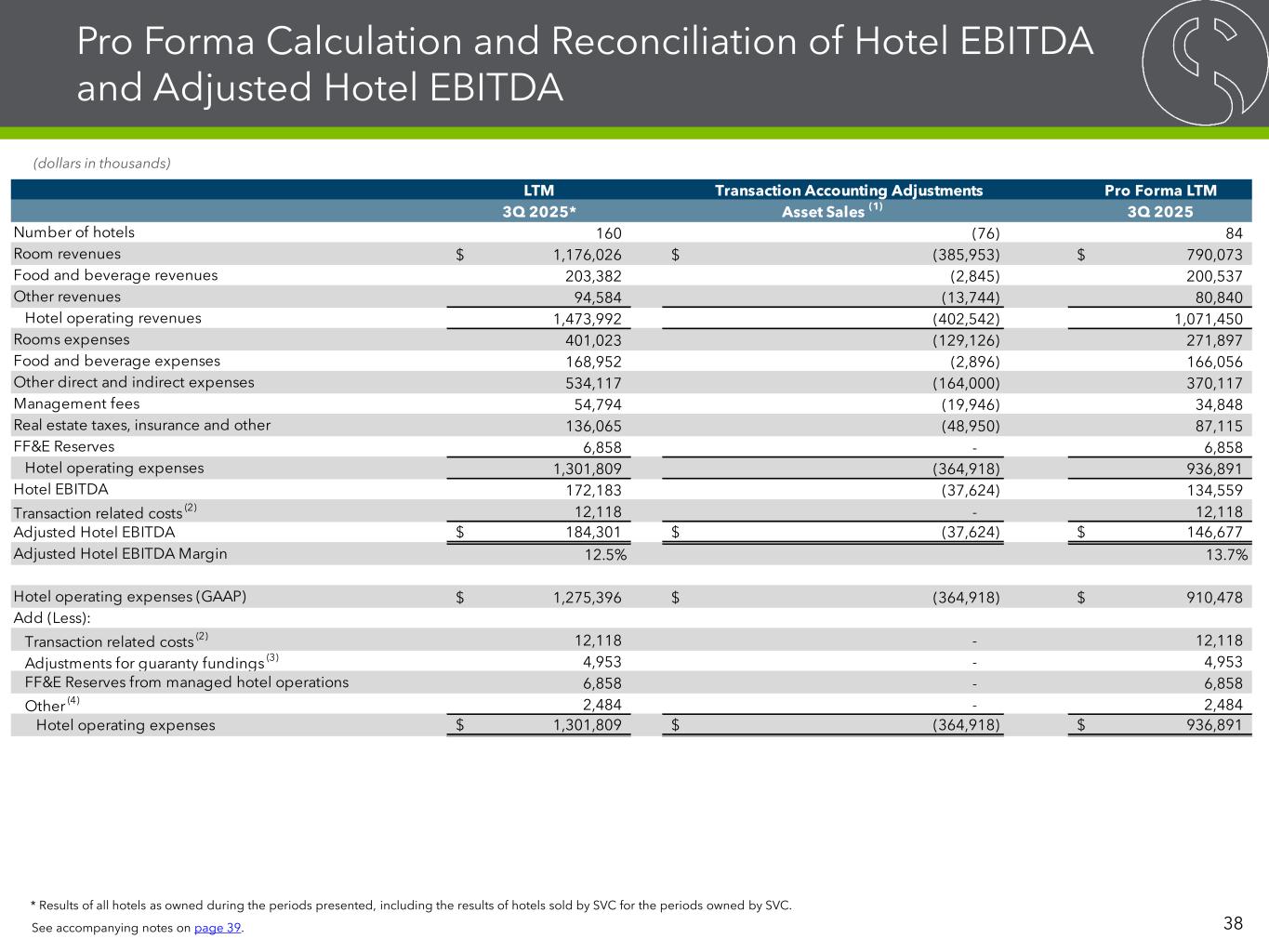 Pro Forma Calculation and Reconciliation of Hotel EBITDA and Adjusted Hotel EBITDA * Results of all hotels as owned during the periods presented, including the results of hotels sold by SVC for the periods owned by SVC. 38 (dollars in thousands) See accompanying notes on page 39. LTM Pro Forma LTM 3Q 2025* Asset Sales (1) 3Q 2025 Number of hotels 160 (76) 84 Room revenues 1,176,026$ (385,953)$ 790,073$ Food and beverage revenues 203,382 (2,845) 200,537 Other revenues 94,584 (13,744) 80,840 Hotel operating revenues 1,473,992 (402,542) 1,071,450 Rooms expenses 401,023 (129,126) 271,897 Food and beverage expenses 168,952 (2,896) 166,056 Other direct and indirect expenses 534,117 (164,000) 370,117 Management fees 54,794 (19,946) 34,848 Real estate taxes, insurance and other 136,065 (48,950) 87,115 FF&E Reserves 6,858 - 6,858 Hotel operating expenses 1,301,809 (364,918) 936,891 Hotel EBITDA 172,183 (37,624) 134,559 Transaction related costs (2) 12,118 - 12,118 Adjusted Hotel EBITDA 184,301$ (37,624)$ 146,677$ Adjusted Hotel EBITDA Margin 12.5% 13.7% Hotel operating expenses (GAAP) 1,275,396$ (364,918)$ 910,478$ Add (Less): Transaction related costs (2) 12,118 - 12,118 Adjustments for guaranty fundings (3) 4,953 - 4,953 FF&E Reserves from managed hotel operations 6,858 - 6,858 Other (4) 2,484 - 2,484 Hotel operating expenses 1,301,809$ (364,918)$ 936,891$ Transaction Accounting Adjustments