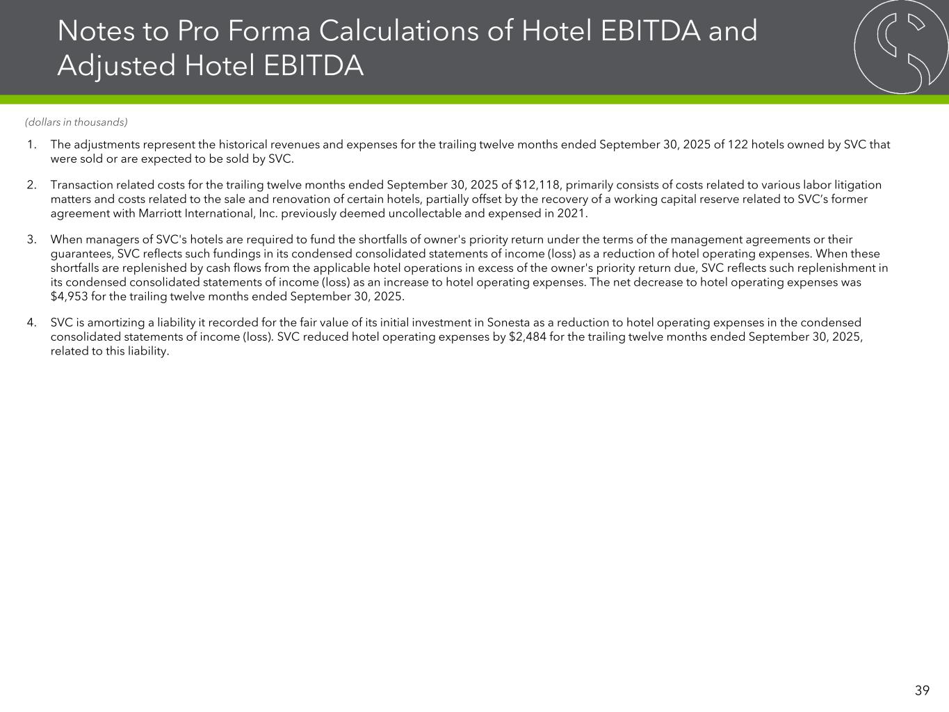 Notes to Pro Forma Calculations of Hotel EBITDA and Adjusted Hotel EBITDA 1. The adjustments represent the historical revenues and expenses for the trailing twelve months ended September 30, 2025 of 122 hotels owned by SVC that were sold or are expected to be sold by SVC. 2. Transaction related costs for the trailing twelve months ended September 30, 2025 of $12,118, primarily consists of costs related to various labor litigation matters and costs related to the sale and renovation of certain hotels, partially offset by the recovery of a working capital reserve related to SVC’s former agreement with Marriott International, Inc. previously deemed uncollectable and expensed in 2021. 3. When managers of SVC's hotels are required to fund the shortfalls of owner's priority return under the terms of the management agreements or their guarantees, SVC reflects such fundings in its condensed consolidated statements of income (loss) as a reduction of hotel operating expenses. When these shortfalls are replenished by cash flows from the applicable hotel operations in excess of the owner's priority return due, SVC reflects such replenishment in its condensed consolidated statements of income (loss) as an increase to hotel operating expenses. The net decrease to hotel operating expenses was $4,953 for the trailing twelve months ended September 30, 2025. 4. SVC is amortizing a liability it recorded for the fair value of its initial investment in Sonesta as a reduction to hotel operating expenses in the condensed consolidated statements of income (loss). SVC reduced hotel operating expenses by $2,484 for the trailing twelve months ended September 30, 2025, related to this liability. 39 (dollars in thousands)