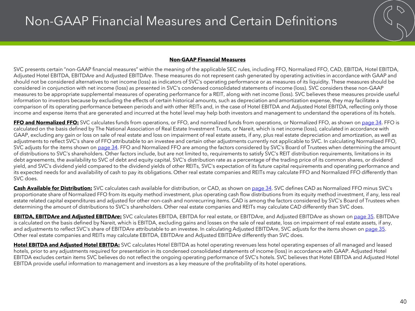 Non-GAAP Financial Measures and Certain Definitions Non-GAAP Financial Measures SVC presents certain “non-GAAP financial measures” within the meaning of the applicable SEC rules, including FFO, Normalized FFO, CAD, EBITDA, Hotel EBITDA, Adjusted Hotel EBITDA, EBITDAre and Adjusted EBITDAre. These measures do not represent cash generated by operating activities in accordance with GAAP and should not be considered alternatives to net income (loss) as indicators of SVC's operating performance or as measures of its liquidity. These measures should be considered in conjunction with net income (loss) as presented in SVC's condensed consolidated statements of income (loss). SVC considers these non-GAAP measures to be appropriate supplemental measures of operating performance for a REIT, along with net income (loss). SVC believes these measures provide useful information to investors because by excluding the effects of certain historical amounts, such as depreciation and amortization expense, they may facilitate a comparison of its operating performance between periods and with other REITs and, in the case of Hotel EBITDA and Adjusted Hotel EBITDA, reflecting only those income and expense items that are generated and incurred at the hotel level may help both investors and management to understand the operations of its hotels. FFO and Normalized FFO: SVC calculates funds from operations, or FFO, and normalized funds from operations, or Normalized FFO, as shown on page 34. FFO is calculated on the basis defined by The National Association of Real Estate Investment Trusts, or Nareit, which is net income (loss), calculated in accordance with GAAP, excluding any gain or loss on sale of real estate and loss on impairment of real estate assets, if any, plus real estate depreciation and amortization, as well as adjustments to reflect SVC's share of FFO attributable to an investee and certain other adjustments currently not applicable to SVC. In calculating Normalized FFO, SVC adjusts for the items shown on page 34. FFO and Normalized FFO are among the factors considered by SVC's Board of Trustees when determining the amount of distributions to SVC's shareholders. Other factors include, but are not limited to, requirements to satisfy SVC’s REIT distribution requirements, limitations in its debt agreements, the availability to SVC of debt and equity capital, SVC's distribution rate as a percentage of the trading price of its common shares, or dividend yield, and SVC’s dividend yield compared to the dividend yields of other REITs, SVC's expectation of its future capital requirements and operating performance and its expected needs for and availability of cash to pay its obligations. Other real estate companies and REITs may calculate FFO and Normalized FFO differently than SVC does. Cash Available for Distribution: SVC calculates cash available for distribution, or CAD, as shown on page 34. SVC defines CAD as Normalized FFO minus SVC’s proportionate share of Normalized FFO from its equity method investment, plus operating cash flow distributions from its equity method investment, if any, less real estate related capital expenditures and adjusted for other non-cash and nonrecurring items. CAD is among the factors considered by SVC's Board of Trustees when determining the amount of distributions to SVC's shareholders. Other real estate companies and REITs may calculate CAD differently than SVC does. EBITDA, EBITDAre and Adjusted EBITDAre: SVC calculates EBITDA, EBITDA for real estate, or EBITDAre, and Adjusted EBITDAre as shown on page 35. EBITDAre is calculated on the basis defined by Nareit, which is EBITDA, excluding gains and losses on the sale of real estate, loss on impairment of real estate assets, if any, and adjustments to reflect SVC's share of EBITDAre attributable to an investee. In calculating Adjusted EBITDAre, SVC adjusts for the items shown on page 35. Other real estate companies and REITs may calculate EBITDA, EBITDAre and Adjusted EBITDAre differently than SVC does. Hotel EBITDA and Adjusted Hotel EBITDA: SVC calculates Hotel EBITDA as hotel operating revenues less hotel operating expenses of all managed and leased hotels, prior to any adjustments required for presentation in its condensed consolidated statements of income (loss) in accordance with GAAP. Adjusted Hotel EBITDA excludes certain items SVC believes do not reflect the ongoing operating performance of SVC’s hotels. SVC believes that Hotel EBITDA and Adjusted Hotel EBITDA provide useful information to management and investors as a key measure of the profitability of its hotel operations. 40