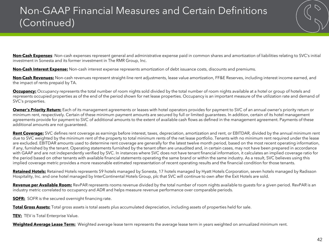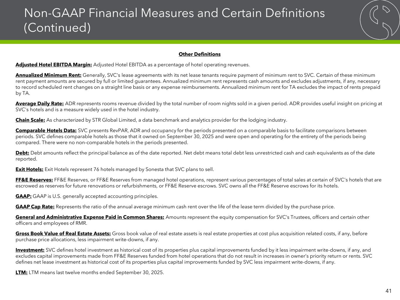 Non-GAAP Financial Measures and Certain Definitions (Continued) Other Definitions Adjusted Hotel EBITDA Margin: Adjusted Hotel EBITDA as a percentage of hotel operating revenues. Annualized Minimum Rent: Generally, SVC's lease agreements with its net lease tenants require payment of minimum rent to SVC. Certain of these minimum rent payment amounts are secured by full or limited guarantees. Annualized minimum rent represents cash amounts and excludes adjustments, if any, necessary to record scheduled rent changes on a straight line basis or any expense reimbursements. Annualized minimum rent for TA excludes the impact of rents prepaid by TA. Average Daily Rate: ADR represents rooms revenue divided by the total number of room nights sold in a given period. ADR provides useful insight on pricing at SVC's hotels and is a measure widely used in the hotel industry. Chain Scale: As characterized by STR Global Limited, a data benchmark and analytics provider for the lodging industry. Comparable Hotels Data: SVC presents RevPAR, ADR and occupancy for the periods presented on a comparable basis to facilitate comparisons between periods. SVC defines comparable hotels as those that it owned on September 30, 2025 and were open and operating for the entirety of the periods being compared. There were no non-comparable hotels in the periods presented. Debt: Debt amounts reflect the principal balance as of the date reported. Net debt means total debt less unrestricted cash and cash equivalents as of the date reported. Exit Hotels: Exit Hotels represent 76 hotels managed by Sonesta that SVC plans to sell. FF&E Reserves: FF&E Reserves, or FF&E Reserves from managed hotel operations, represent various percentages of total sales at certain of SVC's hotels that are escrowed as reserves for future renovations or refurbishments, or FF&E Reserve escrows. SVC owns all the FF&E Reserve escrows for its hotels. GAAP: GAAP is U.S. generally accepted accounting principles. GAAP Cap Rate: Represents the ratio of the annual average minimum cash rent over the life of the lease term divided by the purchase price. General and Administrative Expense Paid in Common Shares: Amounts represent the equity compensation for SVC’s Trustees, officers and certain other officers and employees of RMR. Gross Book Value of Real Estate Assets: Gross book value of real estate assets is real estate properties at cost plus acquisition related costs, if any, before purchase price allocations, less impairment write-downs, if any. Investment: SVC defines hotel investment as historical cost of its properties plus capital improvements funded by it less impairment write-downs, if any, and excludes capital improvements made from FF&E Reserves funded from hotel operations that do not result in increases in owner’s priority return or rents. SVC defines net lease investment as historical cost of its properties plus capital improvements funded by SVC less impairment write-downs, if any. LTM: LTM means last twelve months ended September 30, 2025. 41