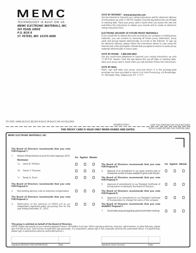 VOTE BY INTERNET - www.proxyvote.com Use the Internet to transmit your voting instructions and for electronic delivery of information up until 11:59 P.M. Eastern Time the day before the cut-off date or meeting date. Have your proxy card in hand when you access the web site and follow the instructions to obtain your records and to create an electronic voting instruction form. ELECTRONIC DELIVERY OF FUTURE PROXY MATERIALS If you would like to reduce the costs incurred by our company in mailing proxy materials, you can consent to receiving all future proxy statements, proxy cards and annual reports electronically via e-mail or the Internet. To sign up for electronic delivery, please follow the instructions above to vote using the Internet and, when prompted, indicate that you agree to receive or access proxy materials electronically in future years. VOTE BY PHONE - 1-800-690-6903 Use any touch-tone telephone to transmit your voting instructions up until 11:59 P.M. Eastern Time the day before the cut-off date or meeting date. Have your proxy card in hand when you call and then follow the instructions. VOTE BY MAIL Mark, sign and date your proxy card and return it in the postage-paid envelope we have provided or return it to Vote Processing, c/o Broadridge, 51 Mercedes Way, Edgewood, NY 11717. MEMC ELECTRONIC MATERIALS, INC. 501 PEARL DRIVE P.O. BOX 8 ST. PETERS, MO 63376-0008 TO VOTE, MARK BLOCKS BELOW IN BLUE OR BLACK INK AS FOLLOWS: KEEP THIS PORTION FOR YOUR RECORDS DETACH AND RETURN THIS PORTION ONLY THIS PROXY CARD IS VALID ONLY WHEN SIGNED AND DATED. MEMC ELECTRONIC MATERIALS, INC. The Board of Directors recommends that you vote FOR Proposal 1: 1. Election of three Directors to serve for a term expiring in 2016. For Against Abstain Nominees: 1a. James B. Williams For Against Abstain The Board of Directors recommends that you vote FOR Proposal 4: 1b. Steven V. Tesoriere 4. Approval of an amendment to our equity incentive plan to increase the number of shares available for grant under the plan. 1c. Randy H. Zwirn The Board of Directors recommends that you vote FOR Proposal 5: The Board of Directors recommends that you vote FOR Proposal 2: 5. Approval of amendments to our Restated Certificate of Incorporation to declassify the Board of Directors. 2. Non-binding advisory vote on executive compensation. The Board of Directors recommends that you vote FOR Proposal 6: The Board of Directors recommends that you vote FOR Proposal 3: 6. Approval of an amendment to our Restated Certificate of Incorporation to change the name of the company. The Board of Directors recommends that you vote AGAINST Proposal 7: 3. Ratification of the selection of KPMG LLP as our independent registered public accounting firm for the year ending December 31, 2013. 7. Stockholder proposal regarding special stockholder meetings. This proxy is solicited on behalf of the Board of Directors. (NOTE: Please sign exactly as your name(s) appear(s) hereon. All holders must sign. When signing as attorney, executor, administrator, or other fiduciary, please give full title as such. Joint owners should each sign personally. If a corporation, please sign in full corporate name by the authorized officer. If a partnership, please sign in partnership name by authorized person.) Date Date Signature [PLEASE SIGN WITHIN BOX] Signature (Joint Owners) M56854-P37811 |