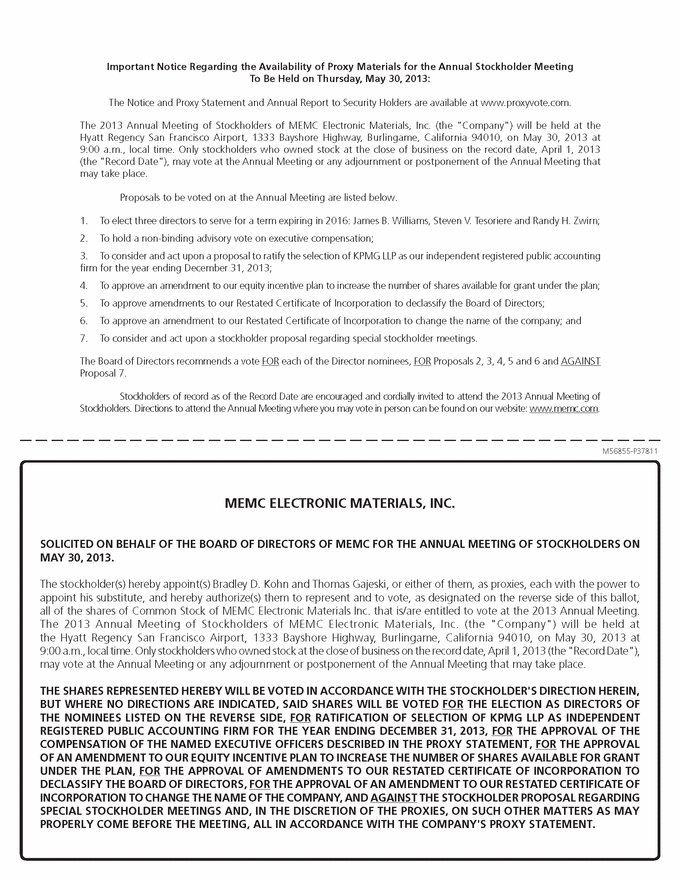 Important Notice Regarding the Availability of Proxy Materials for the Annual Stockholder Meeting To Be Held on Thursday, May 30, 2013: The Notice and Proxy Statement and Annual Report to Security Holders are available at www.proxyvote.com. The 2013 Annual Meeting of Stockholders of MEMC Electronic Materials, Inc. (the "Company") will be held at the Hyatt Regency San Francisco Airport, 1333 Bayshore Highway, Burlingame, California 94010, on May 30, 2013 at 9:00 a.m., local time. Only stockholders who owned stock at the close of business on the record date, April 1, 2013 (the "Record Date"), may vote at the Annual Meeting or any adjournment or postponement of the Annual Meeting that may take place. Proposals to be voted on at the Annual Meeting are listed below. 1. To elect three directors to serve for a term expiring in 2016: James B. Williams, Steven V. Tesoriere and Randy H. Zwirn; 2. To hold a non-binding advisory vote on executive compensation; 3. To consider and act upon a proposal to ratify the selection of KPMG LLP as our independent registered public accounting firm for the year ending December 31, 2013; 4. To approve an amendment to our equity incentive plan to increase the number of shares available for grant under the plan; 5. To approve amendments to our Restated Certificate of Incorporation to declassify the Board of Directors; 6. To approve an amendment to our Restated Certificate of Incorporation to change the name of the company; and 7. To consider and act upon a stockholder proposal regarding special stockholder meetings. The Board of Directors recommends a vote FOR each of the Director nominees, FOR Proposals 2, 3, 4, 5 and 6 and AGAINST Proposal 7. Stockholders of record as of the Record Date are encouraged and cordially invited to attend the 2013 Annual Meeting of Stockholders. Directions to attend the Annual Meeting where you may vote in person can be found on our website: www.memc.com. M56855-P37811 MEMC ELECTRONIC MATERIALS, INC. SOLICITED ON BEHALF OF THE BOARD OF DIRECTORS OF MEMC FOR THE ANNUAL MEETING OF STOCKHOLDERS ON MAY 30, 2013. The stockholder(s) hereby appoint(s) Bradley D. Kohn and Thomas Gajeski, or either of them, as proxies, each with the power to appoint his substitute, and hereby authorize(s) them to represent and to vote, as designated on the reverse side of this ballot, all of the shares of Common Stock of MEMC Electronic Materials Inc. that is/are entitled to vote at the 2013 Annual Meeting. The 2013 Annual Meeting of Stockholders of MEMC Electronic Materials, Inc. (the "Company") will be held at the Hyatt Regency San Francisco Airport, 1333 Bayshore Highway, Burlingame, California 94010, on May 30, 2013 at 9:00 a.m., local time. Only stockholders who owned stock at the close of business on the record date, April 1, 2013 (the "Record Date"), may vote at the Annual Meeting or any adjournment or postponement of the Annual Meeting that may take place. THE SHARES REPRESENTED HEREBY WILL BE VOTED IN ACCORDANCE WITH THE STOCKHOLDER'S DIRECTION HEREIN, BUT WHERE NO DIRECTIONS ARE INDICATED, SAID SHARES WILL BE VOTED FOR THE ELECTION AS DIRECTORS OF THE NOMINEES LISTED ON THE REVERSE SIDE, FOR RATIFICATION OF SELECTION OF KPMG LLP AS INDEPENDENT REGISTERED PUBLIC ACCOUNTING FIRM FOR THE YEAR ENDING DECEMBER 31, 2013, FOR THE APPROVAL OF THE COMPENSATION OF THE NAMED EXECUTIVE OFFICERS DESCRIBED IN THE PROXY STATEMENT, FOR THE APPROVAL OF AN AMENDMENT TO OUR EQUITY INCENTIVE PLAN TO INCREASE THE NUMBER OF SHARES AVAILABLE FOR GRANT UNDER THE PLAN, FOR THE APPROVAL OF AMENDMENTS TO OUR RESTATED CERTIFICATE OF INCORPORATION TO DECLASSIFY THE BOARD OF DIRECTORS, FOR THE APPROVAL OF AN AMENDMENT TO OUR RESTATED CERTIFICATE OF INCORPORATION TO CHANGE THE NAME OF THE COMPANY, AND AGAINST THE STOCKHOLDER PROPOSAL REGARDING SPECIAL STOCKHOLDER MEETINGS AND, IN THE DISCRETION OF THE PROXIES, ON SUCH OTHER MATTERS AS MAY PROPERLY COME BEFORE THE MEETING, ALL IN ACCORDANCE WITH THE COMPANY'S PROXY STATEMENT. |