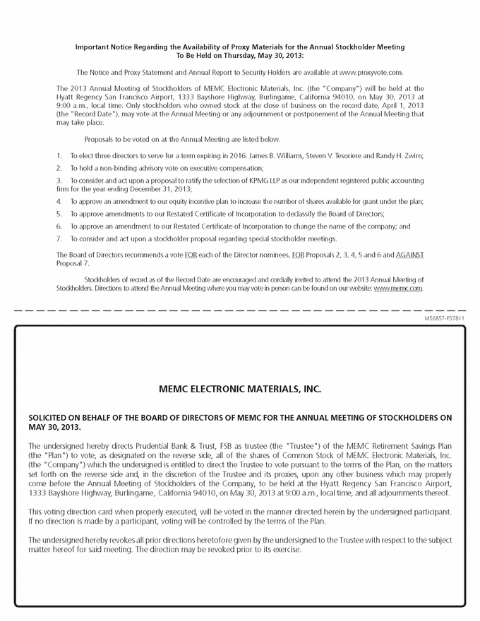 Important Notice Regarding the Availability of Proxy Materials for the Annual Stockholder Meeting To Be Held on Thursday, May 30, 2013: The Notice and Proxy Statement and Annual Report to Security Holders are available at www.proxyvote.com. The 2013 Annual Meeting of Stockholders of MEMC Electronic Materials, Inc. (the "Company") will be held at the Hyatt Regency San Francisco Airport, 1333 Bayshore Highway, Burlingame, California 94010, on May 30, 2013 at 9:00 a.m., local time. Only stockholders who owned stock at the close of business on the record date, April 1, 2013 (the "Record Date"), may vote at the Annual Meeting or any adjournment or postponement of the Annual Meeting that may take place. Proposals to be voted on at the Annual Meeting are listed below. 1. To elect three directors to serve for a term expiring in 2016: James B. Williams, Steven V. Tesoriere and Randy H. Zwirn; 2. To hold a non-binding advisory vote on executive compensation; 3. To consider and act upon a proposal to ratify the selection of KPMG LLP as our independent registered public accounting firm for the year ending December 31, 2013; 4. To approve an amendment to our equity incentive plan to increase the number of shares available for grant under the plan; 5. To approve amendments to our Restated Certificate of Incorporation to declassify the Board of Directors; 6. To approve an amendment to our Restated Certificate of Incorporation to change the name of the company; and 7. To consider and act upon a stockholder proposal regarding special stockholder meetings. The Board of Directors recommends a vote FOR each of the Director nominees, FOR Proposals 2, 3, 4, 5 and 6 and AGAINST Proposal 7. Stockholders of record as of the Record Date are encouraged and cordially invited to attend the 2013 Annual Meeting of Stockholders. Directions to attend the Annual Meeting where you may vote in person can be found on our website: www.memc.com. M56857-P37811 MEMC ELECTRONIC MATERIALS, INC. SOLICITED ON BEHALF OF THE BOARD OF DIRECTORS OF MEMC FOR THE ANNUAL MEETING OF STOCKHOLDERS ON MAY 30, 2013. The undersigned hereby directs Prudential Bank & Trust, FSB as trustee (the "Trustee") of the MEMC Retirement Savings Plan (the "Plan") to vote, as designated on the reverse side, all of the shares of Common Stock of MEMC Electronic Materials, Inc. (the "Company") which the undersigned is entitled to direct the Trustee to vote pursuant to the terms of the Plan, on the matters set forth on the reverse side and, in the discretion of the Trustee and its proxies, upon any other business which may properly come before the Annual Meeting of Stockholders of the Company, to be held at the Hyatt Regency San Francisco Airport, 1333 Bayshore Highway, Burlingame, California 94010, on May 30, 2013 at 9:00 a.m., local time, and all adjournments thereof. This voting direction card when properly executed, will be voted in the manner directed herein by the undersigned participant. If no direction is made by a participant, voting will be controlled by the terms of the Plan. The undersigned hereby revokes all prior directions heretofore given by the undersigned to the Trustee with respect to the subject matter hereof for said meeting. The direction may be revoked prior to its exercise. |