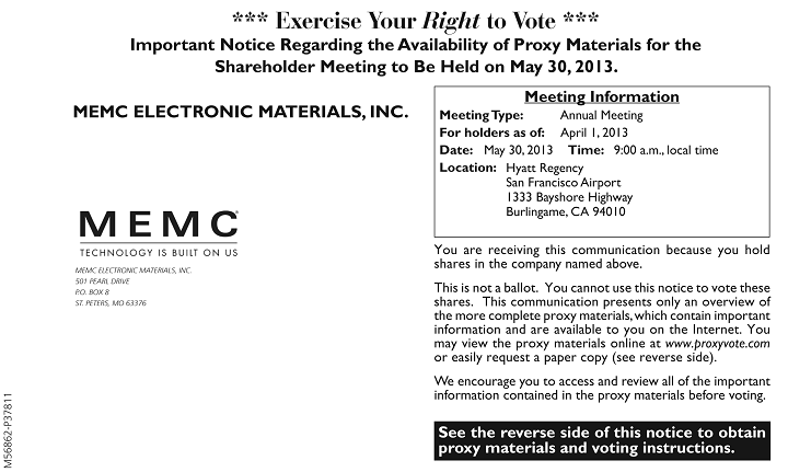 *** Exercise Your Right to Vote *** Important Notice Regarding the Availability of Proxy Materials for the Shareholder Meeting to Be Held on May 30, 2013. Meeting Information MEMC ELECTRONIC MATERIALS, INC. Meeting Type: Annual Meeting For holders as of: April 1, 2013 Date: May 30, 2013 Time: 9:00 a.m., local time Location: Hyatt Regency San Francisco Airport 1333 Bayshore Highway Burlingame, CA 94010 You are receiving this communication because you hold shares in the company named above. This is not a ballot. You cannot use this notice to vote these shares. This communication presents only an overview of the more complete proxy materials, which contain important information and are available to you on the Internet. You may view the proxy materials online at www.proxyvote.com or easily request a paper copy (see reverse side). We encourage you to access and review all of the important information contained in the proxy materials before voting. MEMC ELECTRONIC MATERIALS, INC. 501 PEARL DRIVE P.O. BOX 8 ST. PETERS, MO 63376 M56862-P37811 See the reverse side of this notice to obtain proxy materials and voting instructions. |