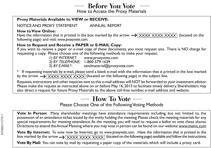 Before You Vote How to Access the Proxy Materials Proxy Materials Available to VIEW or RECEIVE: Proxy Materials Available to VIEW or RECEIVE: NOTICE AND PROXY STATEMENT ANNUAL REPORT How to View Online: Have the information that is printed in the box marked by the arrow (located on the following page) and visit: www.proxyvote.com. How to Request and Receive a PAPER or E-MAIL Copy: If you want to receive a paper or e-mail copy of these documents, you must request one. There is NO charge for requesting a copy. Please choose one of the following methods to make your request: 1) BY INTERNET: www.proxyvote.com 2) BY TELEPHONE: 1-800-579-1639 3) BY E-MAIL*: sendmaterial@proxyvote.com * If requesting materials by e-mail, please send a blank e-mail with the information that is printed in the box marked by the arrow (located on the following page) in the subject line. . XXXX XXXX XXXX . XXXX XXXX XXXX Requests, instructions and other inquiries sent to this e-mail address will NOT be forwarded to your investment advisor. Please make the request as instructed above on or before May 16, 2013 to facilitate timely delivery. Shareholders may also direct a request for future Proxy Materials to the above toll-free number, e-mail address and website. M56863-P37811 How To Vote Please Choose One of the Following Voting Methods Vote In Person: Many shareholder meetings have attendance requirements including, but not limited to, the possession of an attendance ticket issued by the entity holding the meeting. Please check the meeting materials for any special requirements for meeting attendance. At the meeting, you will need to request a ballot to vote these shares. Directions to attend the Annual Meeting where you may vote in person can be found on our website: www.memc.com Vote By Internet: To vote now by Internet, go to www.proxyvote.com. Have the information that is printed in the box marked by the arrow (located on the following page) available and follow the instructions. Vote By Mail: You can vote by mail by requesting a paper copy of the materials, which will include a proxy card. . XXXX XXXX XXXX |
