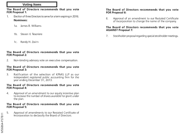 Voting Items The Board of Directors recommends that you vote FOR Proposal 1: The Board of Directors recommends that you vote FOR Proposal 6: 1. Election of three Directors to serve for a term expiring in 2016. 6. Approval of an amendment to our Restated Certificate of Incorporation to change the name of the company. Nominees: 1a. James B. Williams The Board of Directors recommends that you vote AGAINST Proposal 7: 1b. Steven V. Tesoriere 7. Stockholder proposal regarding special stockholder meetings. 1c. Randy H. Zwirn The Board of Directors recommends that you vote FOR Proposal 2: 2. Non-binding advisory vote on executive compensation. The Board of Directors recommends that you vote FOR Proposal 3: 3. Ratification of the selection of KPMG LLP as our independent registered public accounting firm for the year ending December 31, 2013. The Board of Directors recommends that you vote FOR Proposal 4: M56864-P37811 4. Approval of an amendment to our equity incentive plan to increase the number of shares available for grant under the plan. The Board of Directors recommends that you vote FOR Proposal 5: 5. Approval of amendments to our Restated Certificate of Incorporation to declassify the Board of Directors. |