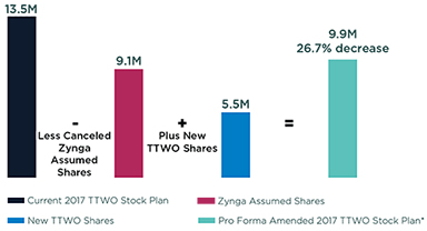 | 4. | Approval of an Amendment and Restatement of the Amended and Restated Take-Two Interactive Software, Inc. 2017 Stock Incentive Plan to reduce the number of shares reserved thereunder that were assumed by the Company in connection with its acquisition of Zynga Inc., to increase the available shares reserved thereunder issuable to all of the Company’s eligible employees, and to modify the share recycling mechanics applicable to outstanding awards that were assumed in connection with the Zynga acquisition | FOR | 83 | |||