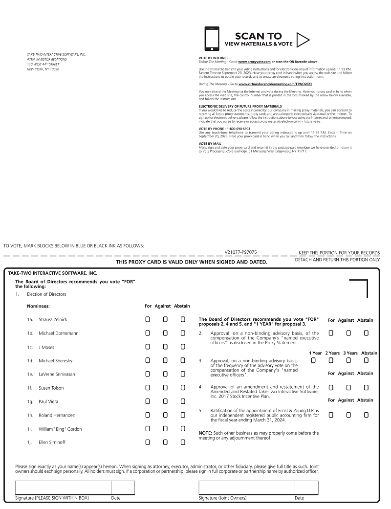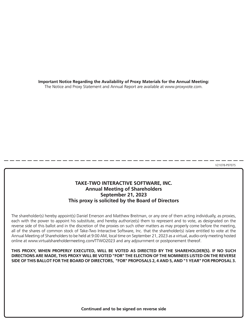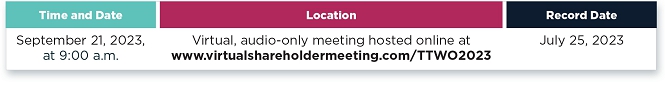 We invite you to attend the Annual Meeting of Shareholders of Take-Two Interactive Software, Inc., that will be held on September 21, 2023, at 9:00 a.m. local time as a virtual, audio-only meeting hosted online at www.virtualshareholdermeeting.com/TTWO2023.