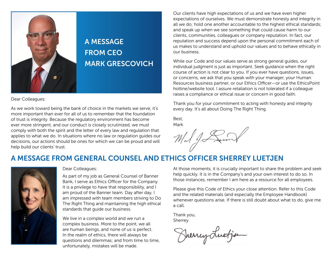 A MESSAGE FROM CEO MARK GRESCOVICH Dear Colleagues: As we work toward being the bank of choice in the markets we serve, it’s more important than ever for all of us to remember that the foundation of trust is integrity. Because the regulatory environment has become ever more stringent, and our conduct is closely scrutinized, we must comply with both the spirit and the letter of every law and regulation that applies to what we do. In situations where no law or regulation guides our decisions, our actions should be ones for which we can be proud and will help build our clients’ trust. Our clients have high expectations of us and we have even higher expectations of ourselves. We must demonstrate honesty and integrity in all we do; hold one another accountable to the highest ethical standards; and speak up when we see something that could cause harm to our clients, communities, colleagues or company reputation. In fact, our reputation and success depend upon the personal commitment each of us makes to understand and uphold our values and to behave ethically in our business. While our Code and our values serve as strong general guides, our individual judgment is just as important. Seek guidance when the right course of action is not clear to you. If you ever have questions, issues, or concerns, we ask that you speak with your manager, your Human Resources business partner, or our Ethics Officer—or use the EthicsPoint hotline/website tool. I assure retaliation is not tolerated if a colleague raises a compliance or ethical issue or concern in good faith. Thank you for your commitment to acting with honesty and integrity every day. It’s all about Doing The Right Thing. Best, Mark A MESSAGE FROM GENERAL COUNSEL AND ETHICS OFFICER SHERREY LUETJEN Dear Colleagues: As part of my job as General Counsel of Banner Bank, I serve as Ethics Officer for the Company. It is a privilege to have that responsibility, and I am proud of the Banner team. Day after day, I am impressed with team members striving to Do The Right Thing and maintaining the high ethical standards that guide our business. We live in a complex world and we run a complex business. More to the point, we all are human beings, and none of us is perfect. In the realm of ethics, there will always be questions and dilemmas; and from time to time, unfortunately, mistakes will be made. At those moments, it is crucially important to share the problem and seek help quickly. It is in the Company’s and your own interest to do so. In those instances, remember I am here as a resource for all employees. Please give this Code of Ethics your close attention. Refer to this Code and the related materials (and especially the Employee Handbook) whenever questions arise. If there is still doubt about what to do, give me a call. Thank you, Sherrey